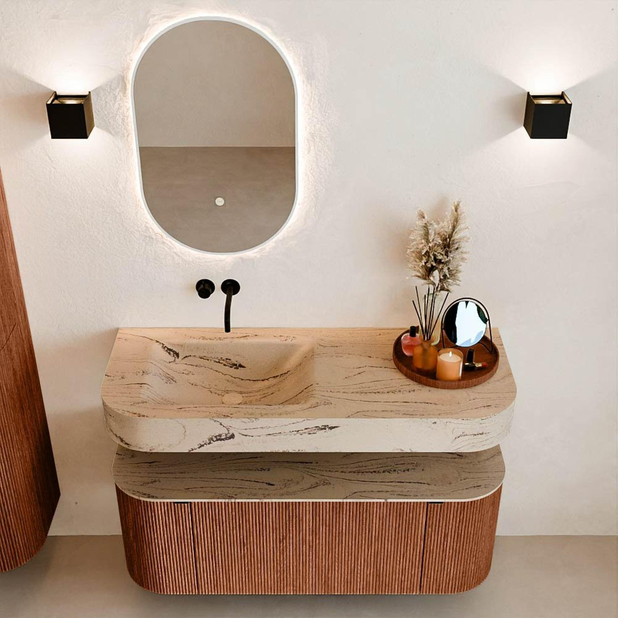 Au-dessus du meuble flotte une vasque suspendue assortie avec des coins arrondis – parfaitement adaptée à la forme du meuble. La vasque est réalisée en Solid Surface et suit subtilement les lignes du meuble sous-jacent, créant une harmonie parfaite. Le plan de travail en Solid Surface forme une base solide, facile d'entretien et complète la combinaison.