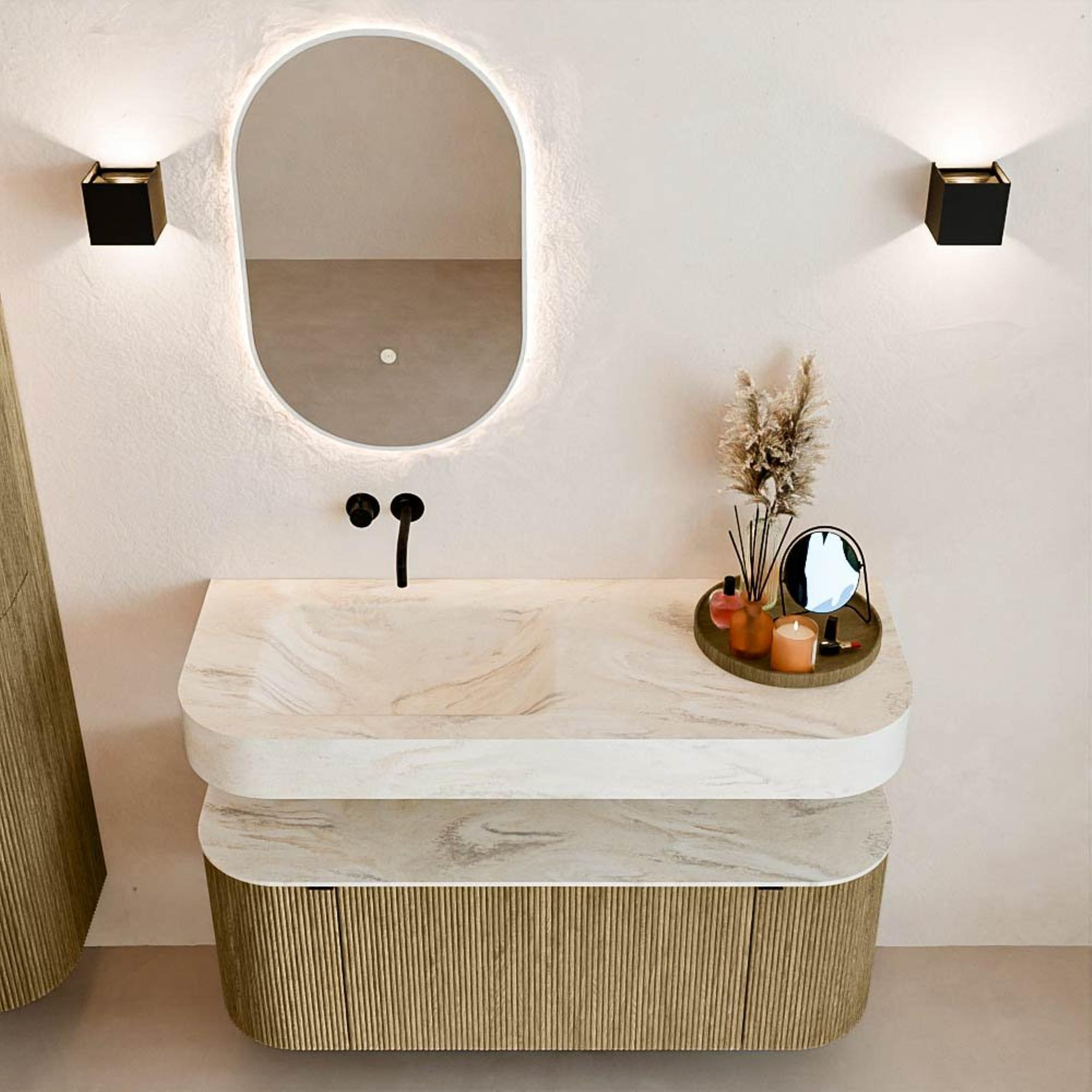 Au-dessus du meuble flotte une vasque suspendue assortie aux coins arrondis – parfaitement adaptée à la forme du meuble. La vasque est réalisée en Solid Surface et suit subtilement les lignes du meuble inférieur, créant ainsi un ensemble harmonieux. Le plan de travail en Solid Surface forme une base solide, facile d'entretien et complète la combinaison.