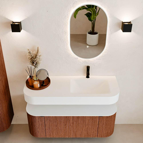 Au-dessus du meuble flotte une vasque suspendue assortie aux coins arrondis – parfaitement adaptée à la forme du meuble. La vasque est réalisée en Solid Surface et suit subtilement les lignes du meuble inférieur, créant un ensemble harmonieux. Le plan de travail en Solid Surface forme une base solide, facile d'entretien et complète la combinaison.