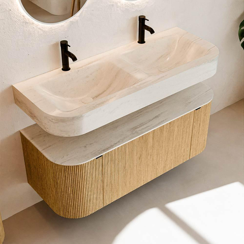 MONDIAZ THOR-DLUX 120cm meuble de salle de bains arrondi gauche + droite couleur Oak avec 1 tiroir et 2 portes. Vasque suspendue CLOUD Double 2 trous de robinet couleur Meli.