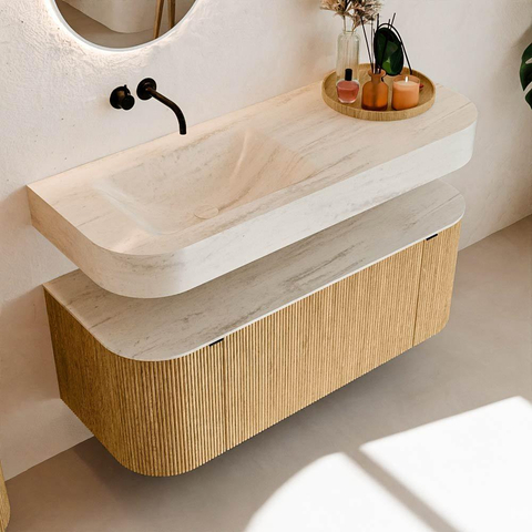 Au-dessus du meuble flotte une vasque suspendue assortie aux coins arrondis – parfaitement adaptée à la forme du meuble. La vasque est réalisée en Solid Surface et suit subtilement les lignes du meuble inférieur, créant ainsi un ensemble harmonieux. Le plan de travail en Solid Surface forme une base solide, facile d'entretien, et complète la combinaison.