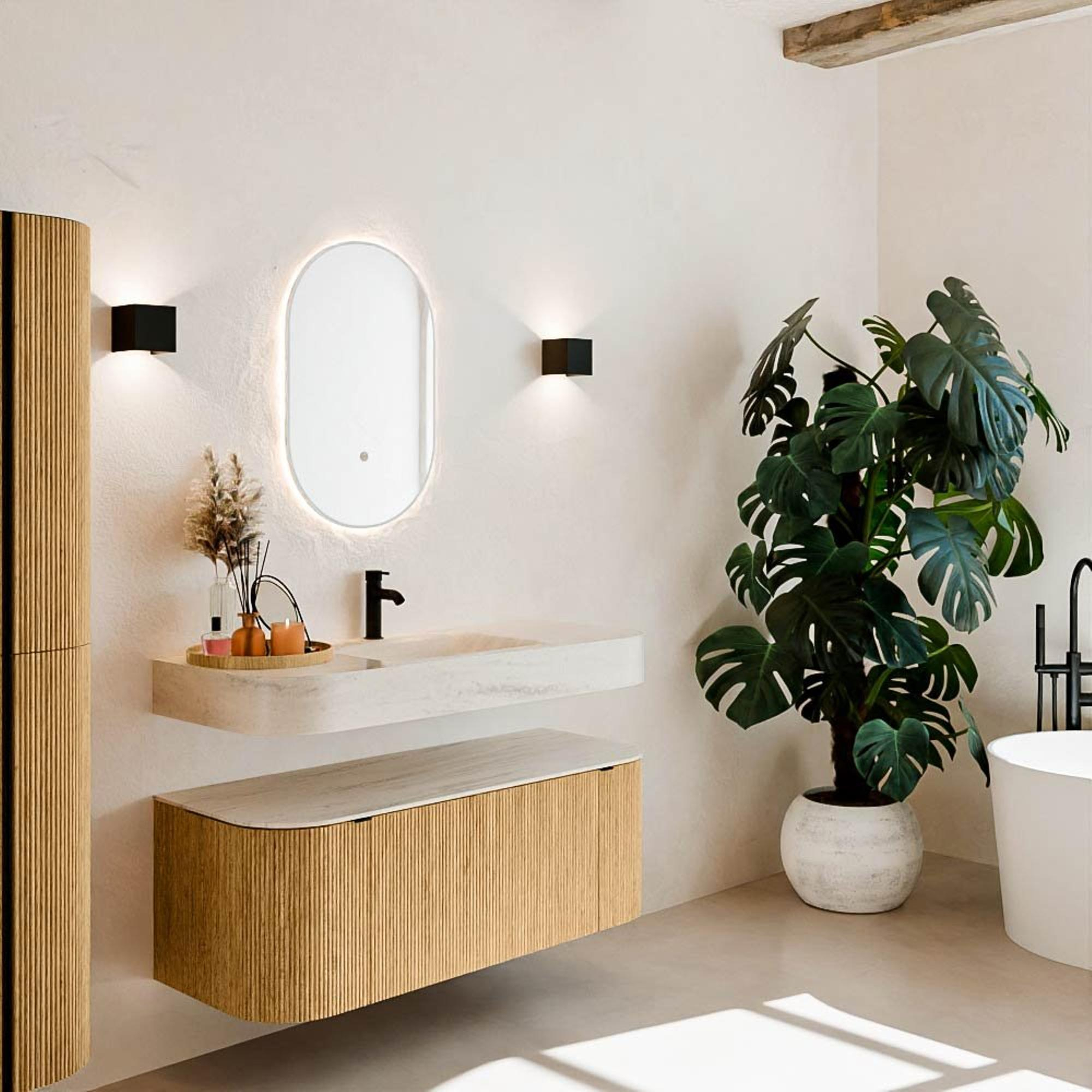 Matériaux naturels dans des tons chauds. Les nervures verticales apportent rythme et texture au design, tandis que le chêne confère une apparence chaleureuse et artisanale. Choisissez parmi 5 teintes de bois OAK, WALNUT, DUSK, SHADOW et RUBY, des couleurs de bois soigneusement sélectionnées pour enrichir aussi bien les salles de bains modernes que classiques.