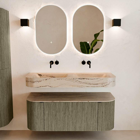 Matériaux naturels dans des tons chauds. Les rainures verticales apportent rythme et texture au design, tandis que le chêne confère une apparence chaleureuse et artisanale. Choisissez parmi 5 teintes de bois OAK, WALNUT, DUSK, SHADOW et RUBY, des couleurs de bois soigneusement sélectionnées pour enrichir les salles de bains modernes et classiques.