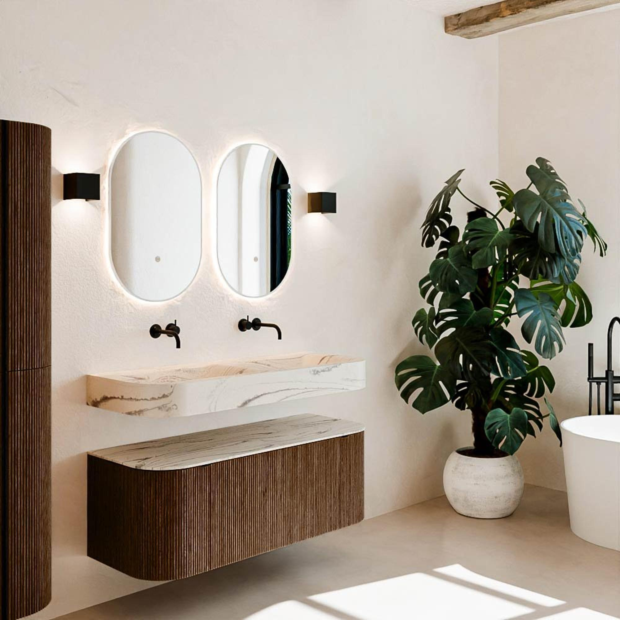 Matériaux naturels dans des tons chauds. Les nervures verticales apportent rythme et texture au design, tandis que le chêne confère une apparence chaleureuse et artisanale. Choisissez parmi 5 teintes de bois OAK, WALNUT, DUSK, SHADOW et RUBY, des couleurs de bois soigneusement sélectionnées pour enrichir les salles de bains modernes et classiques.