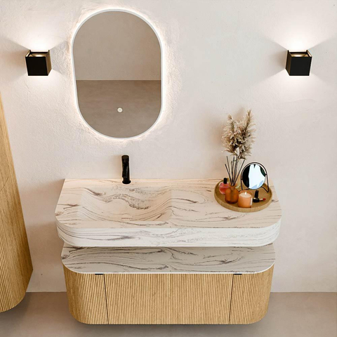 Matériaux naturels dans des tons chauds. Les cannelures verticales apportent rythme et texture au design, tandis que le chêne confère une apparence chaleureuse et artisanale. Choisissez parmi 5 teintes de bois CHÊNE, NOYER, DUSK, SHADOW et RUBY, des couleurs de bois soigneusement sélectionnées pour enrichir les salles de bains modernes et classiques.