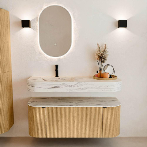 MONDIAZ THOR-DLUX 120cm meuble de salle de bains arrondi gauche + droite couleur Chêne avec 1 tiroir et 2 portes. Vasque suspendue CLOUD Gauche 1 trou de robinet couleur Nata.