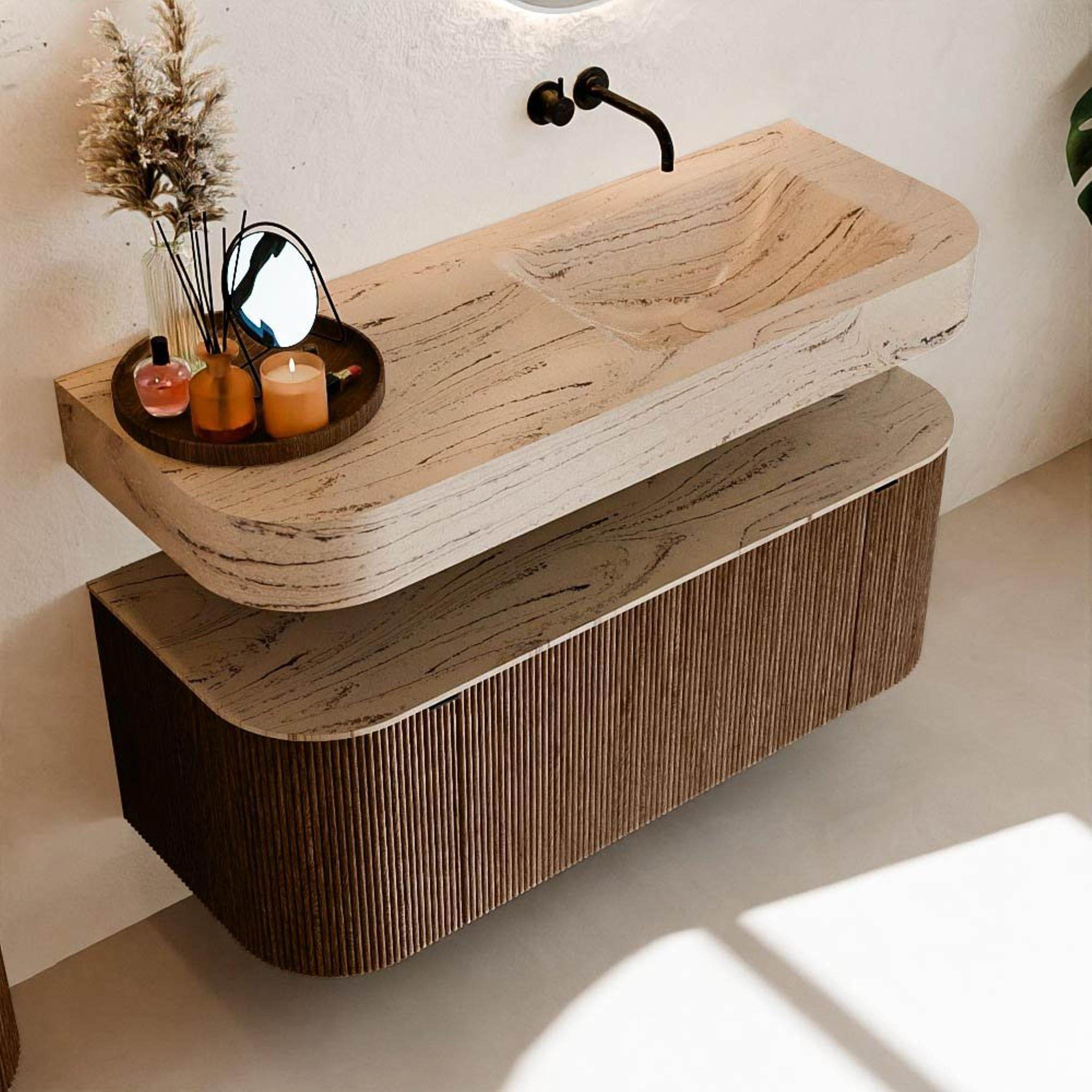MONDIAZ THOR-DLUX 120cm meuble de salle de bains arrondi gauche + droite couleur Walnut avec 1 tiroir et 2 portes. Vasque suspendue CLOUD droite sans trou de robinet couleur Arena.