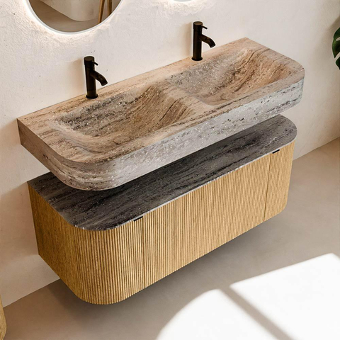 Matériaux naturels dans des tons chauds. Les cannelures verticales apportent rythme et texture au design, tandis que le chêne confère une apparence chaleureuse et artisanale. Choisissez parmi 5 teintes de bois OAK, WALNUT, DUSK, SHADOW et RUBY, des couleurs de bois soigneusement sélectionnées pour enrichir les salles de bains modernes et classiques.