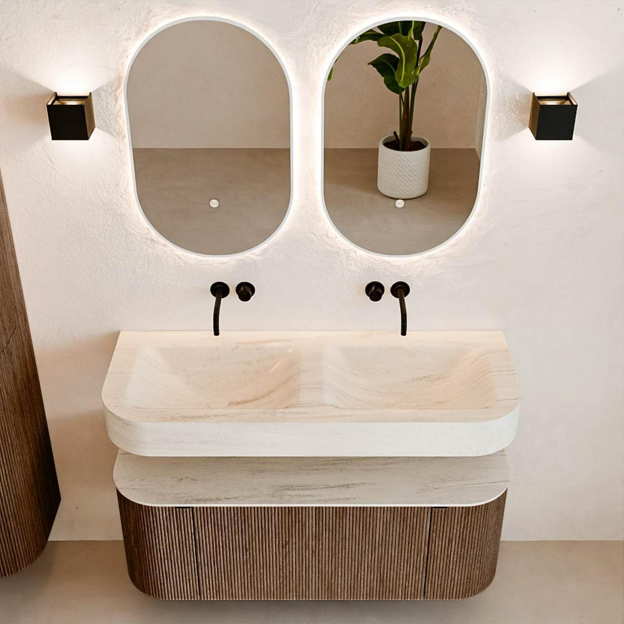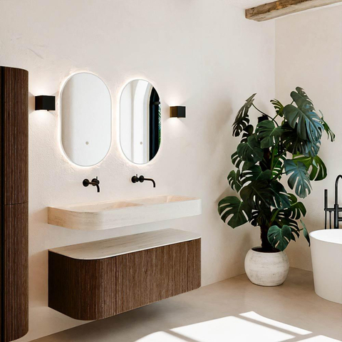Matériaux naturels dans des tons chauds. Les rainures verticales apportent rythme et texture au design, tandis que le chêne confère une apparence chaleureuse et artisanale. Choisissez parmi 5 teintes de bois OAK, WALNUT, DUSK, SHADOW et RUBY, des couleurs de bois soigneusement sélectionnées pour enrichir les salles de bains modernes et classiques.