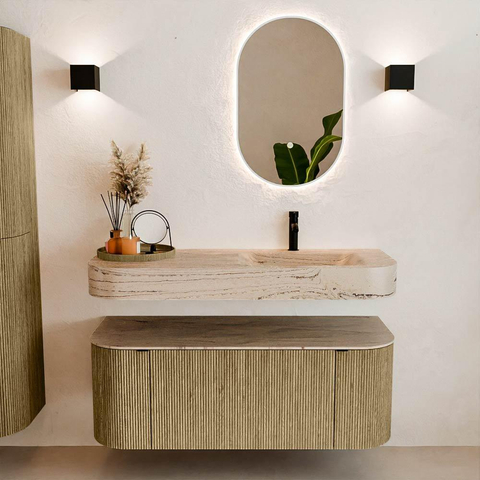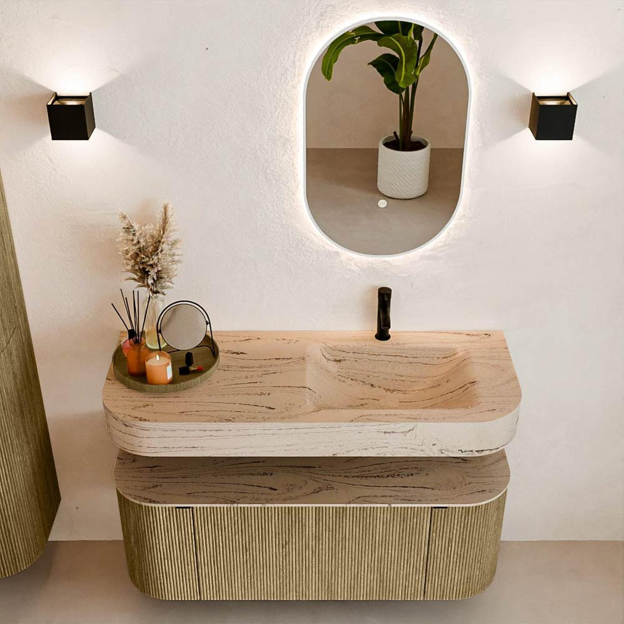 Matériaux naturels dans des tons chauds. Les cannelures verticales apportent rythme et texture au design, tandis que le chêne confère une apparence chaleureuse et artisanale. Choisissez parmi 5 teintes de bois OAK, WALNUT, DUSK, SHADOW et RUBY, des couleurs de bois soigneusement sélectionnées pour enrichir les salles de bains modernes et classiques.