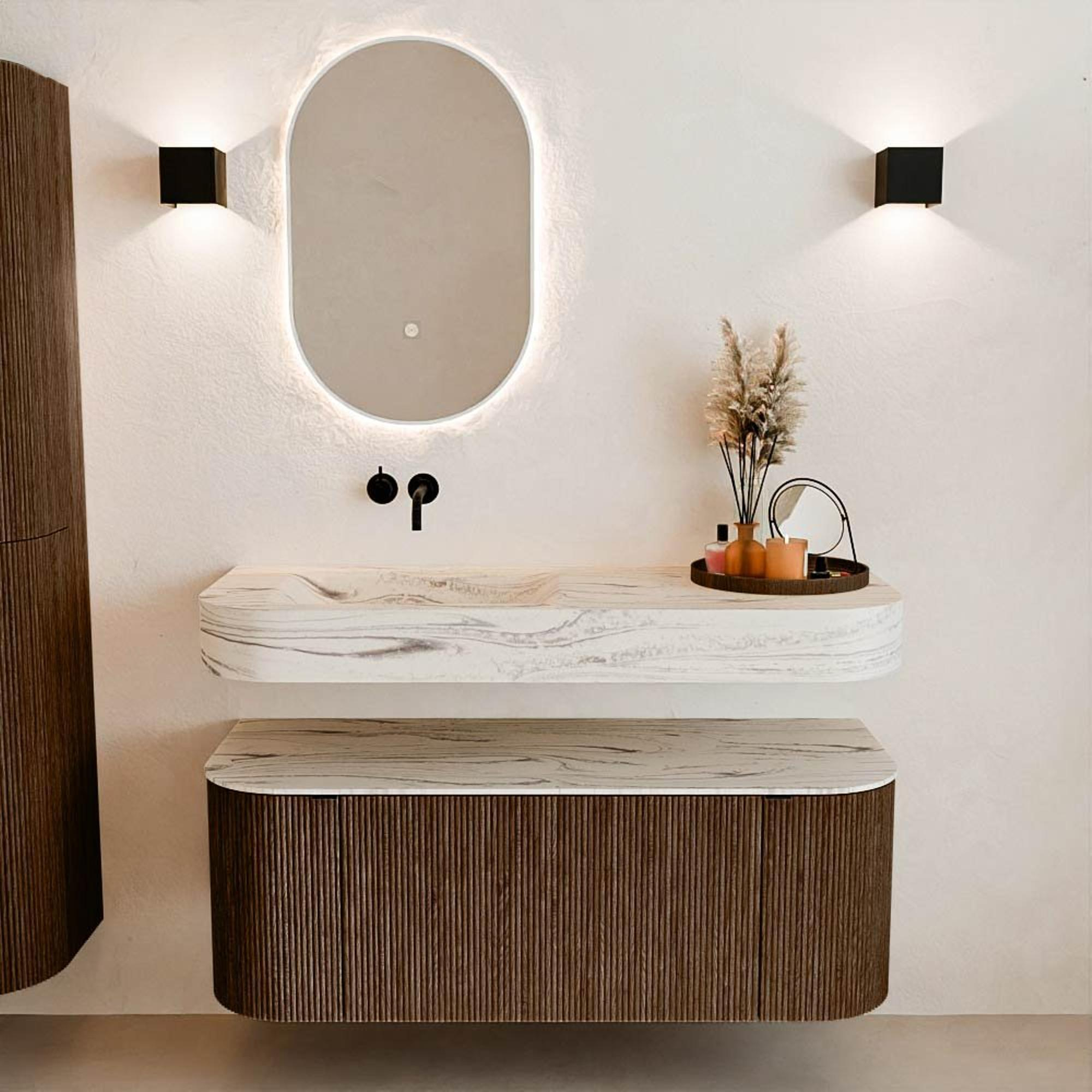 Matériaux naturels dans des tons chauds. Les nervures verticales apportent rythme et texture au design, tandis que le chêne confère une apparence chaleureuse et artisanale. Choisissez parmi 5 teintes de bois OAK, WALNUT, DUSK, SHADOW et RUBY, des couleurs de bois soigneusement sélectionnées pour enrichir les salles de bains modernes et classiques.