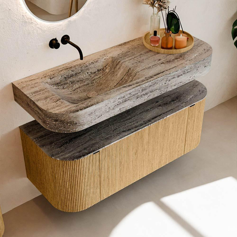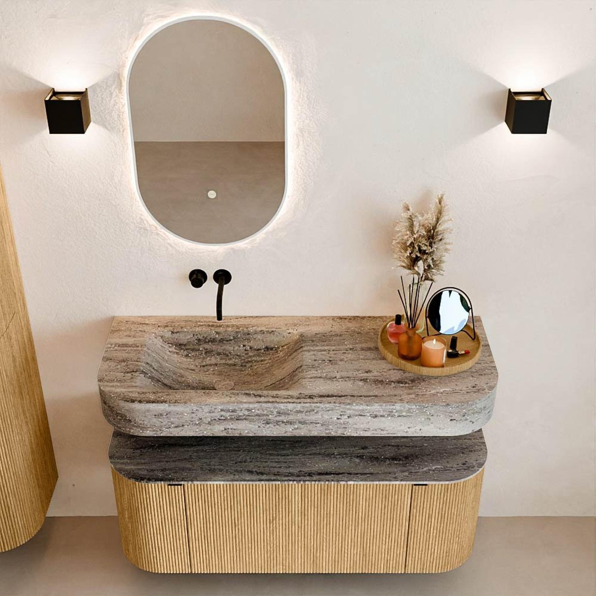 Matériaux naturels aux teintes chaudes. Les cannelures verticales apportent rythme et texture au design, tandis que le chêne confère une apparence chaleureuse et artisanale. Choisissez parmi 5 teintes de bois OAK, WALNUT, DUSK, SHADOW et RUBY, des couleurs de bois soigneusement sélectionnées pour enrichir les salles de bains modernes et classiques.