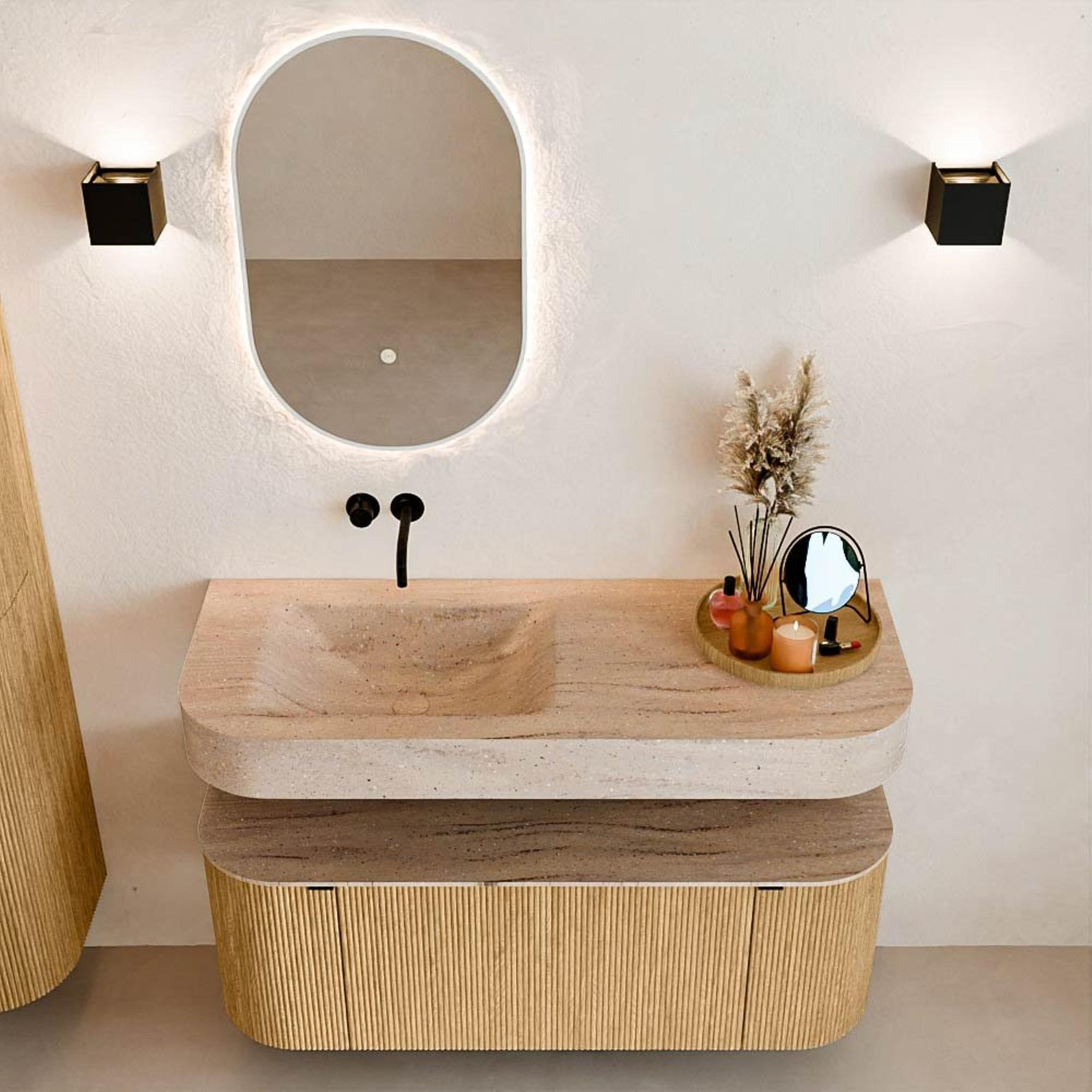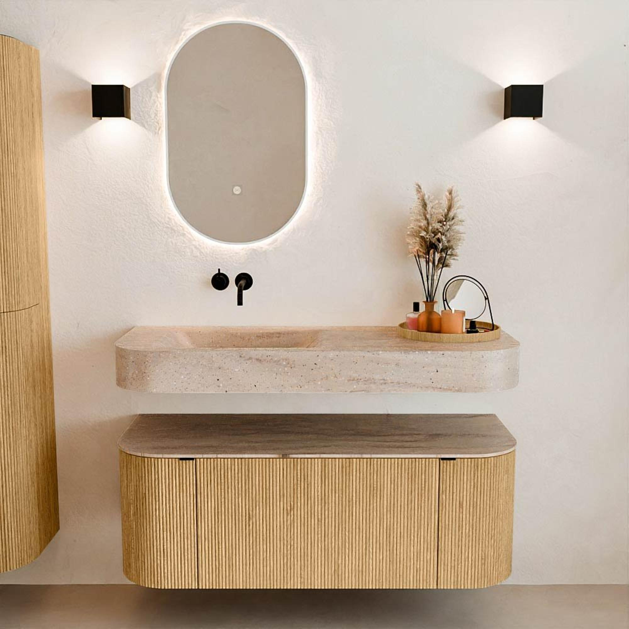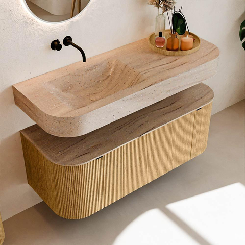 Matériaux naturels dans des tons chauds. Les nervures verticales apportent rythme et texture au design, tandis que le chêne confère une apparence chaleureuse et artisanale. Choisissez parmi 5 teintes de bois OAK, WALNUT, DUSK, SHADOW et RUBY, des couleurs de bois soigneusement sélectionnées pour enrichir les salles de bains modernes et classiques.