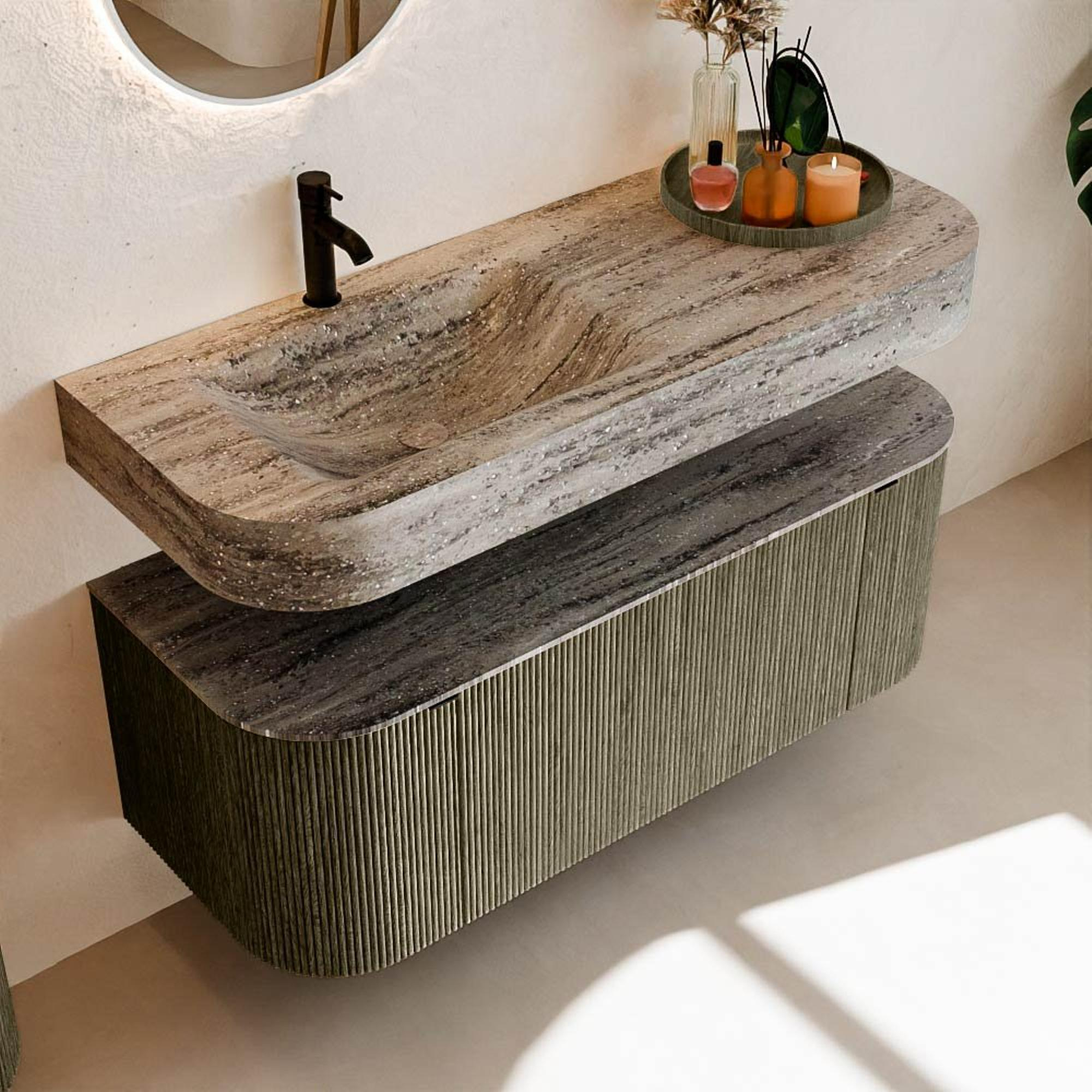 MONDIAZ THOR-DLUX 120cm meuble de salle de bains arrondi gauche + droite couleur Shadow avec 1 tiroir et 2 portes. Vasque suspendue CLOUD Gauche 1 trou de robinet couleur Oza.