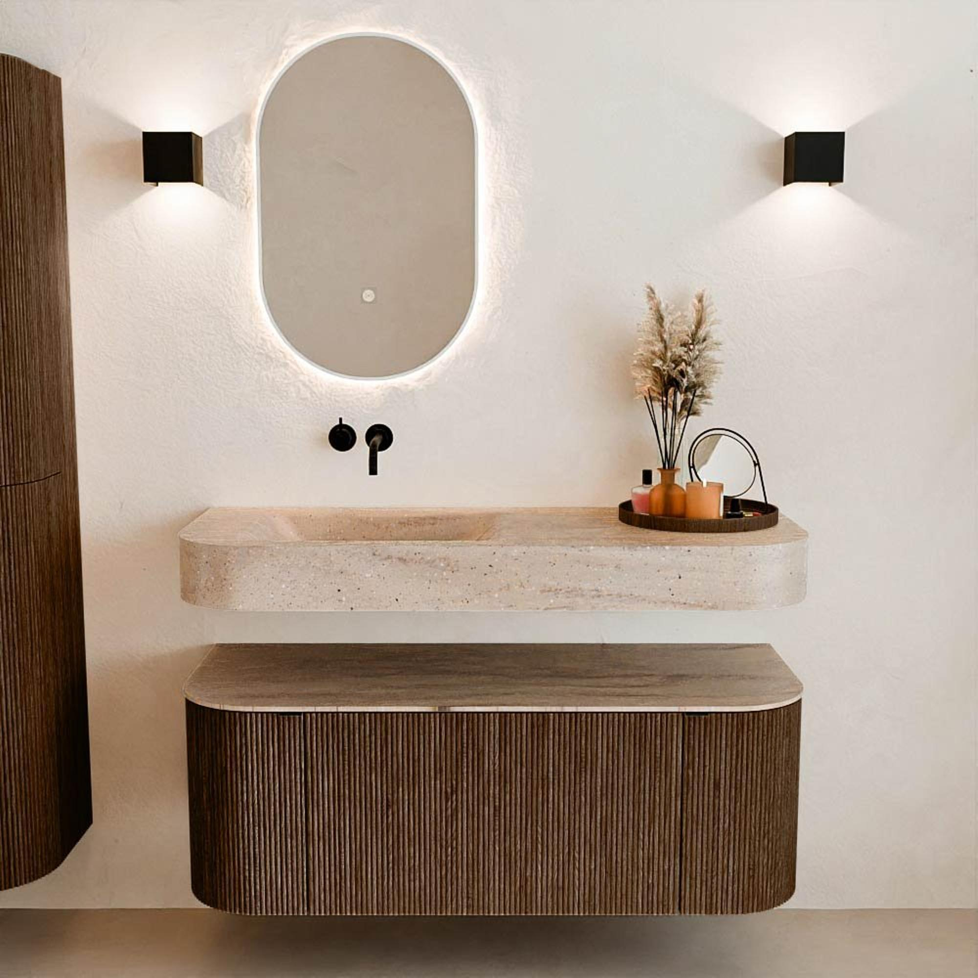 Matériaux naturels dans des tons chauds. Les nervures verticales apportent rythme et texture au design, tandis que le chêne confère une apparence chaleureuse et artisanale. Choisissez parmi 5 teintes de bois OAK, WALNUT, DUSK, SHADOW et RUBY, des couleurs de bois soigneusement sélectionnées pour enrichir les salles de bains modernes et classiques.