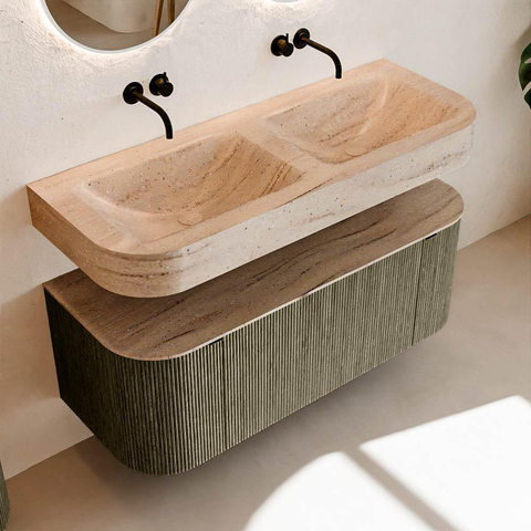 Matériaux naturels dans des tons chauds. Les rainures verticales apportent rythme et texture au design, tandis que le chêne confère une apparence chaleureuse et artisanale. Choisissez parmi 5 teintes de bois OAK, WALNUT, DUSK, SHADOW et RUBY, des couleurs de bois soigneusement sélectionnées pour enrichir les salles de bains modernes et classiques.