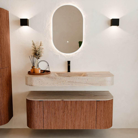 Matériaux naturels dans des tons chauds. Les nervures verticales apportent rythme et texture au design, tandis que le chêne confère une apparence chaleureuse et artisanale. Choisissez parmi 5 teintes de bois OAK, WALNUT, DUSK, SHADOW et RUBY, des couleurs de bois soigneusement sélectionnées pour enrichir les salles de bains modernes et classiques.