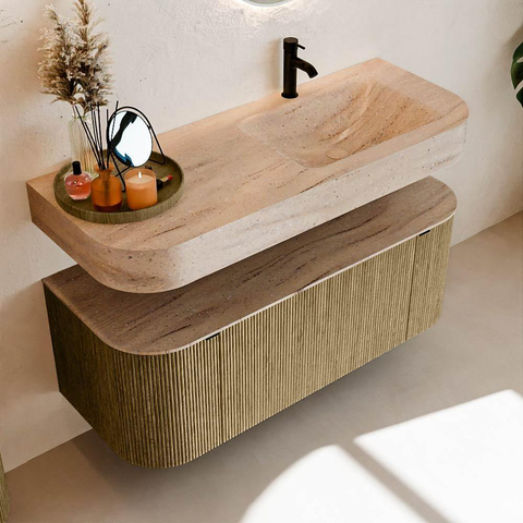 Matériaux naturels dans des tons chauds. Les rainures verticales apportent rythme et texture au design, tandis que le chêne confère une apparence chaleureuse et artisanale. Choisissez parmi 5 teintes de bois OAK, WALNUT, DUSK, SHADOW et RUBY, des couleurs de bois soigneusement sélectionnées pour enrichir les salles de bains modernes et classiques.