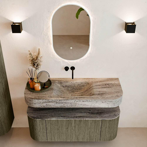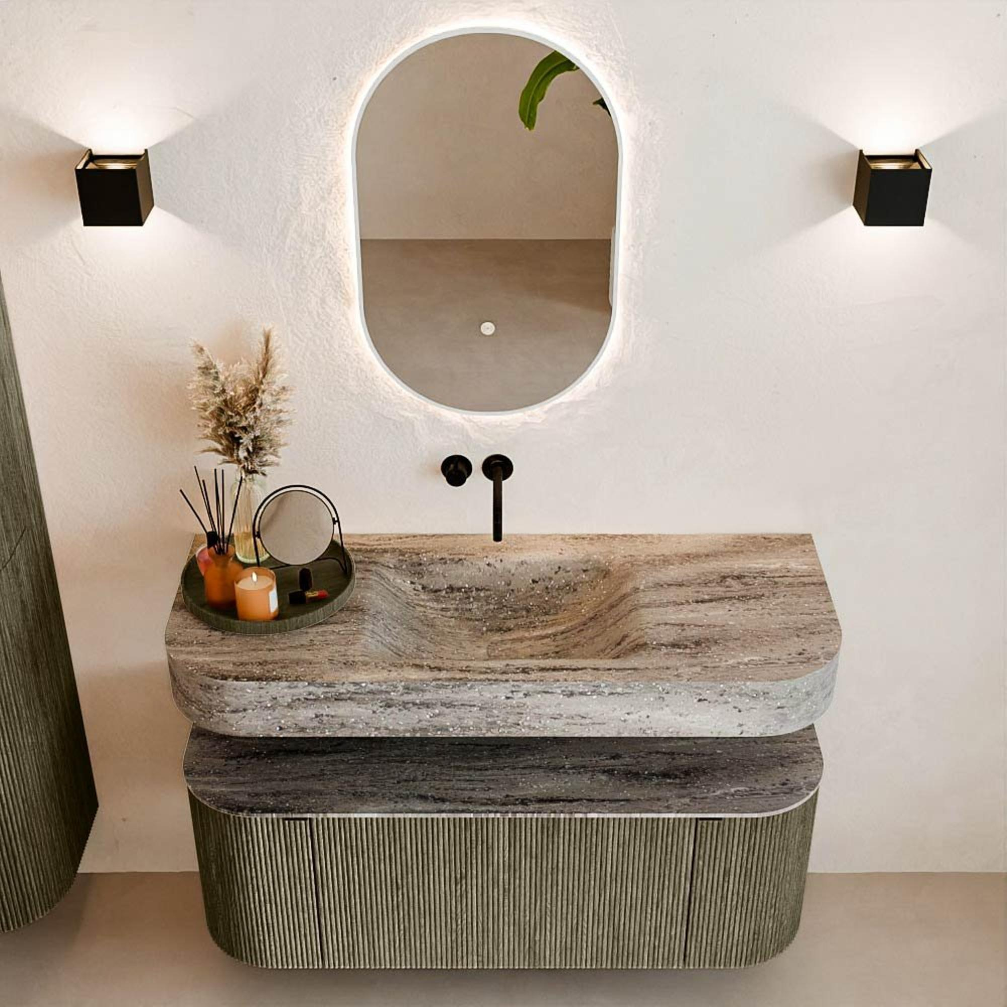 Matériaux naturels aux teintes chaudes. Les nervures verticales apportent rythme et texture au design, tandis que le chêne confère une apparence chaleureuse et artisanale. Choisissez parmi 5 teintes de bois OAK, WALNUT, DUSK, SHADOW et RUBY, des couleurs de bois soigneusement sélectionnées pour enrichir les salles de bains modernes et classiques.