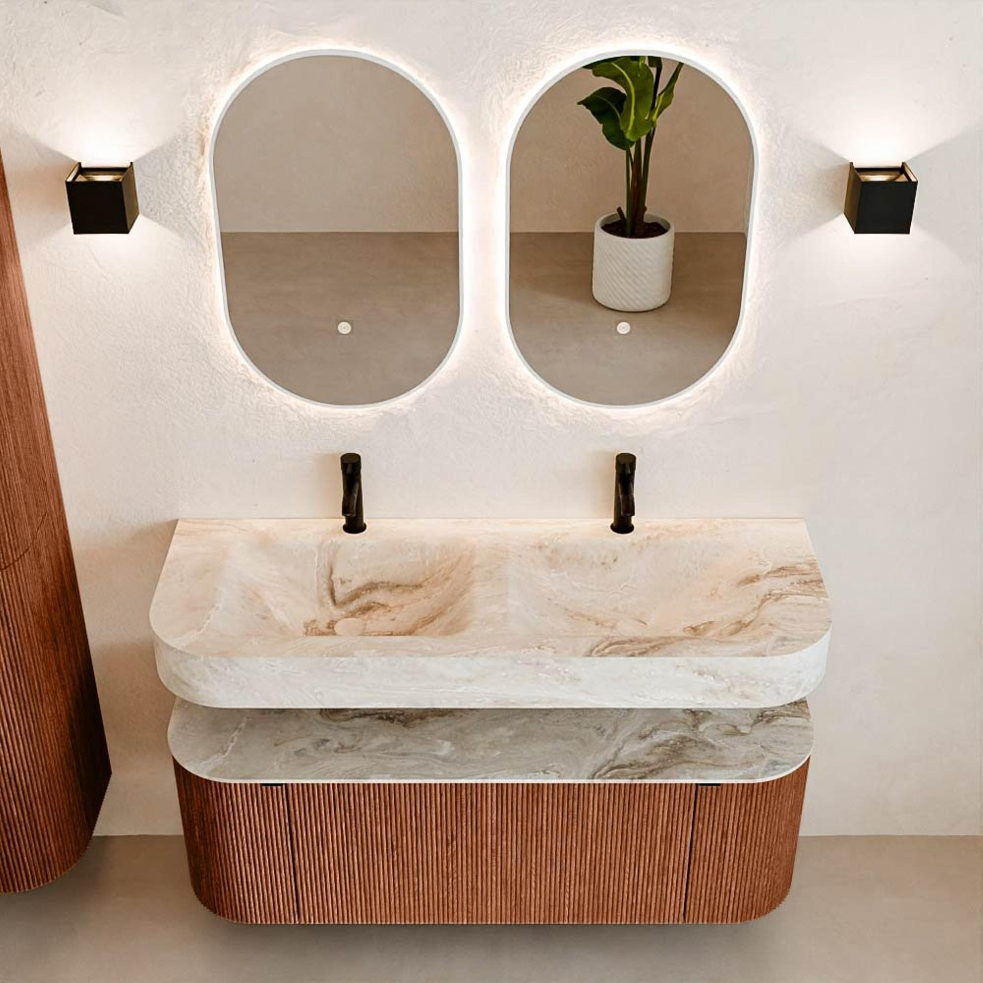 Matériaux naturels dans des tons chauds. Les nervures verticales apportent rythme et texture au design, tandis que le chêne confère une apparence chaleureuse et artisanale. Choisissez parmi 5 teintes de bois OAK, WALNUT, DUSK, SHADOW et RUBY, des couleurs de bois soigneusement sélectionnées pour enrichir les salles de bains modernes et classiques.