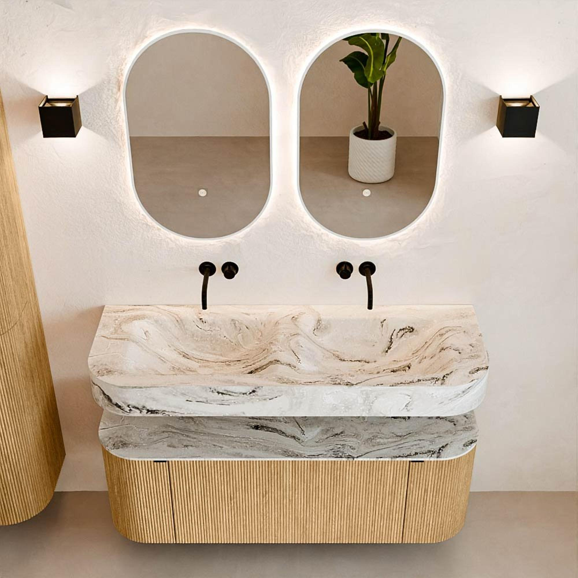 MONDIAZ THOR-DLUX 130cm meuble de salle de bains arrondi gauche + droite couleur Oak avec 1 tiroir et 2 portes. Vasque suspendue CLOUD Double sans trou de robinet couleur Glace.