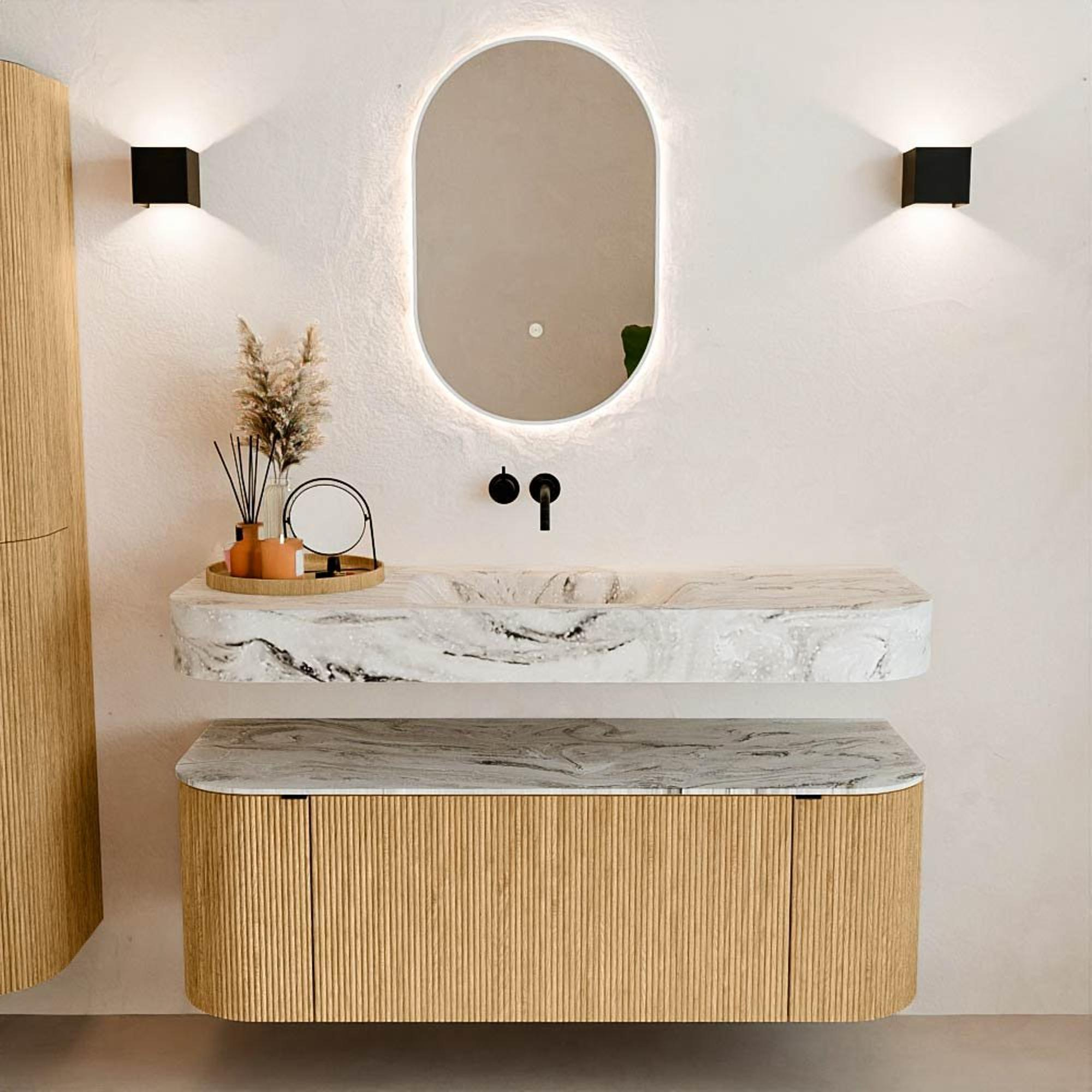 MONDIAZ THOR-DLUX 130cm meuble de salle de bains arrondi gauche + droite couleur Oak avec 1 tiroir et 2 portes. Vasque suspendue CLOUD Centre sans trou de robinet couleur Glace.
