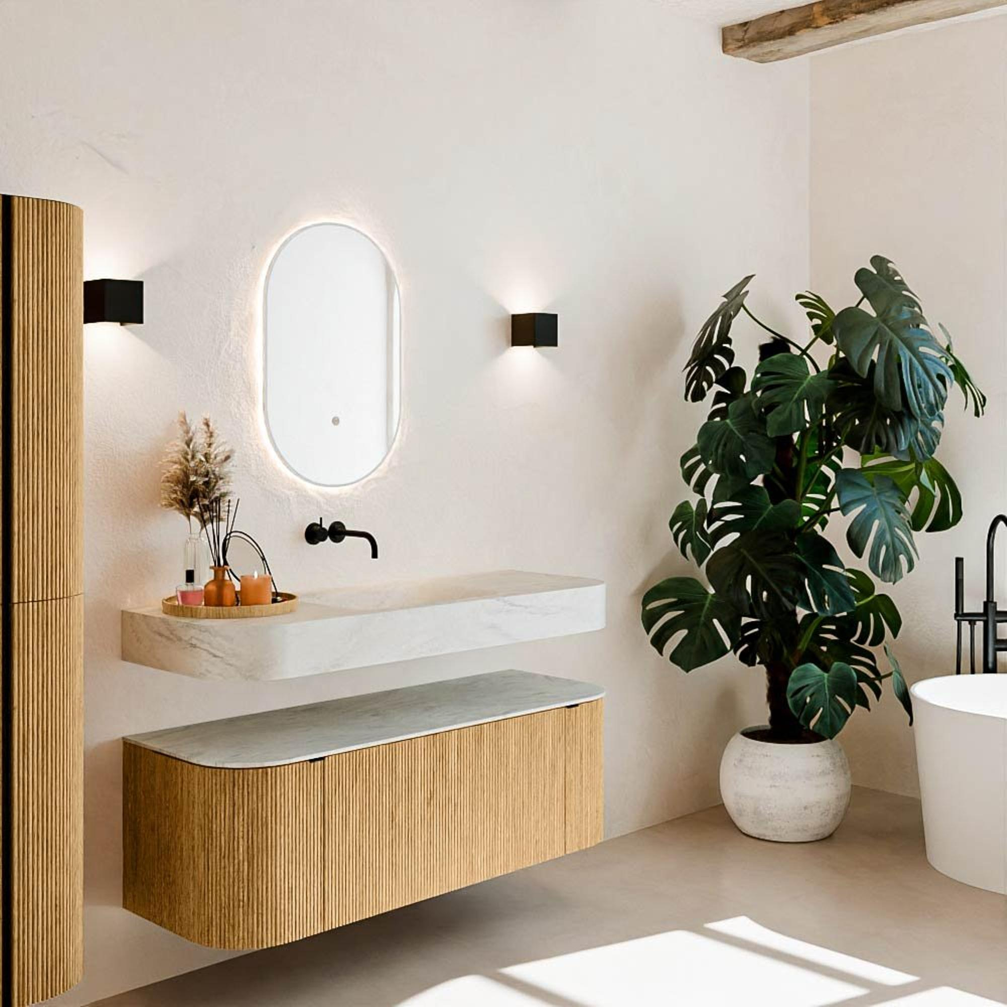 Matériaux naturels dans des tons chauds. Les reliefs verticaux apportent rythme et texture au design, tandis que le chêne confère une apparence chaleureuse et artisanale. Choisissez parmi 5 teintes de bois OAK, WALNUT, DUSK, SHADOW et RUBY, des couleurs de bois soigneusement sélectionnées pour enrichir les salles de bains modernes et classiques.