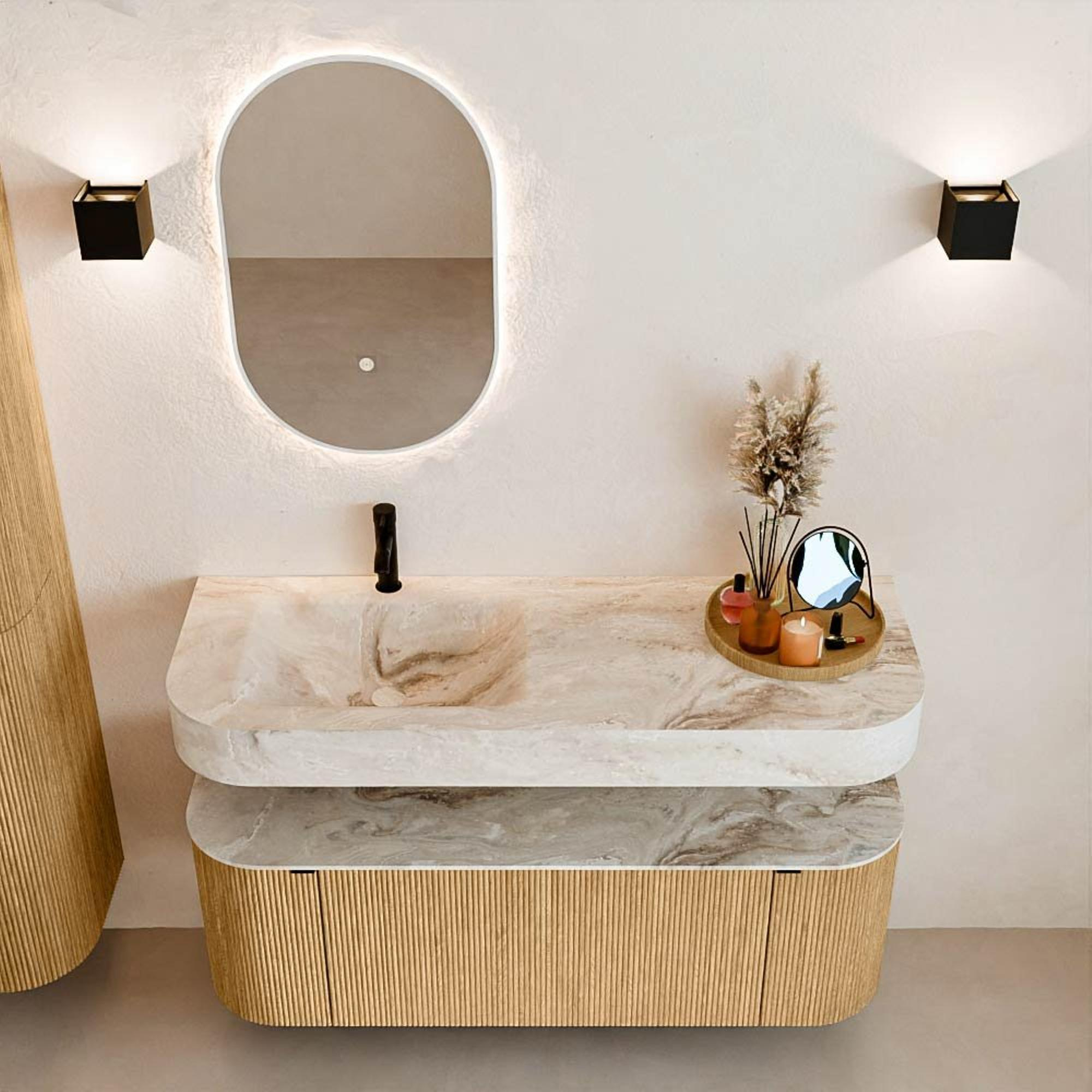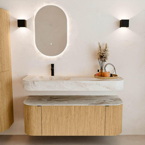 Matériaux naturels dans des tons chauds. Les cannelures verticales apportent rythme et texture au design, tandis que le chêne confère une apparence chaleureuse et artisanale. Choisissez parmi 5 teintes de bois OAK, WALNUT, DUSK, SHADOW et RUBY, des couleurs de bois soigneusement sélectionnées pour enrichir les salles de bains modernes et classiques.