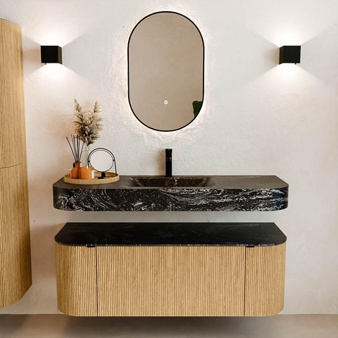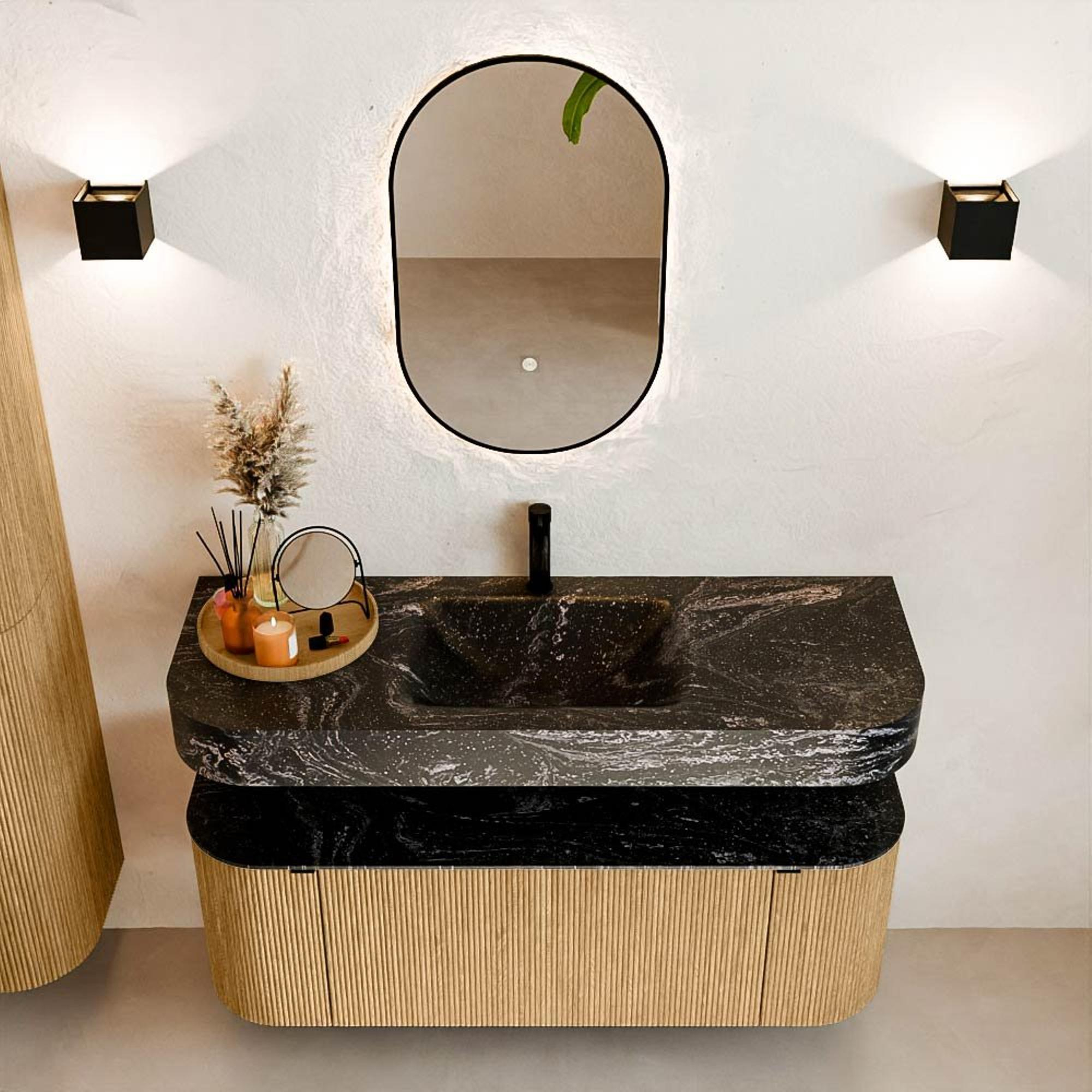 MONDIAZ THOR-DLUX Meuble de salle de bains 130cm arrondi gauche + droite couleur Oak avec 1 tiroir et 2 portes. Vasque suspendue CLOUD Milieu 1 trou de robinet couleur Lava.