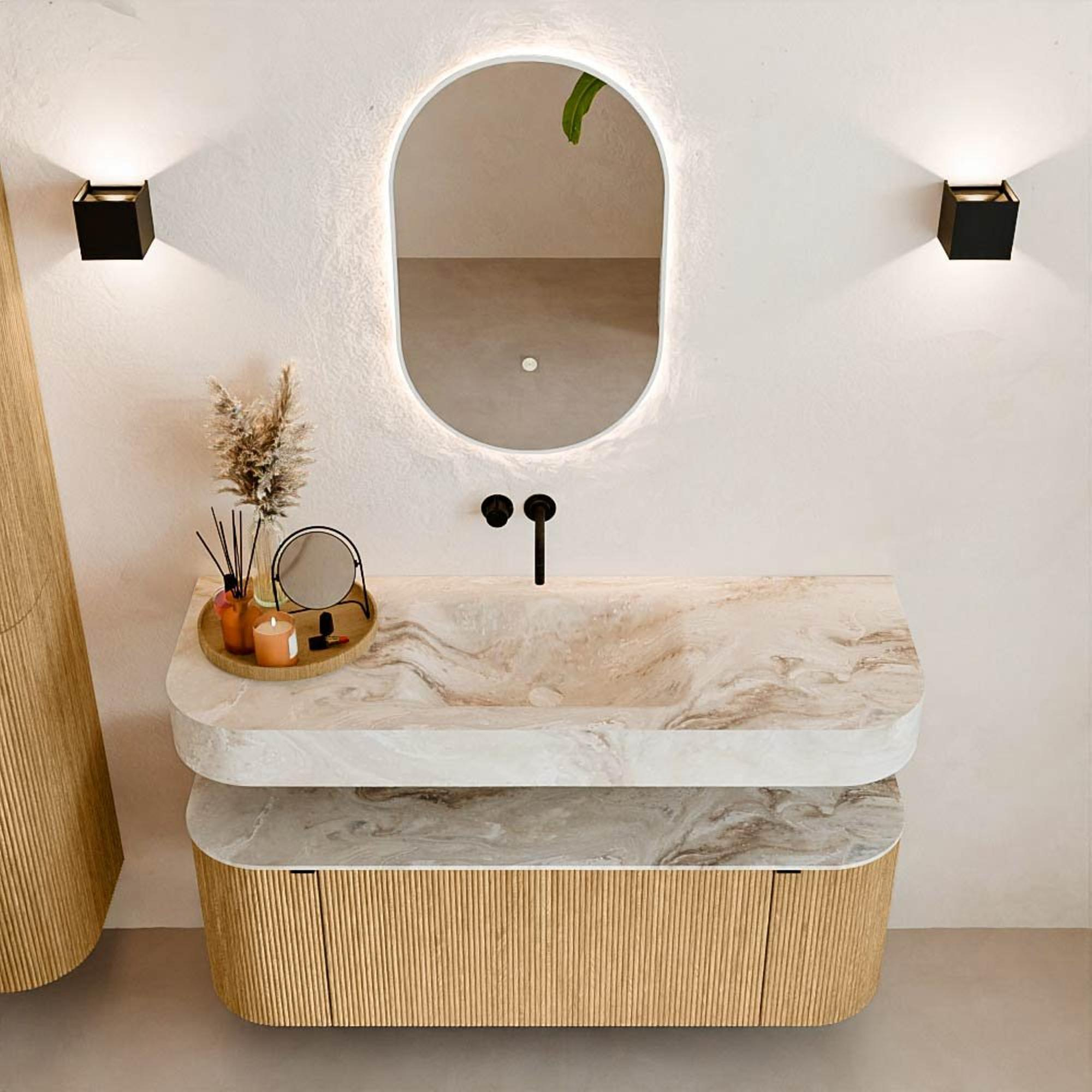 Au-dessus du meuble flotte une vasque suspendue assortie aux coins arrondis – parfaitement adaptée à la forme du meuble. La vasque est en Solid Surface et suit subtilement les lignes du meuble sous-jacent, créant un ensemble harmonieux. Le plan de travail en Solid Surface forme une base solide et facile d'entretien et complète la combinaison.