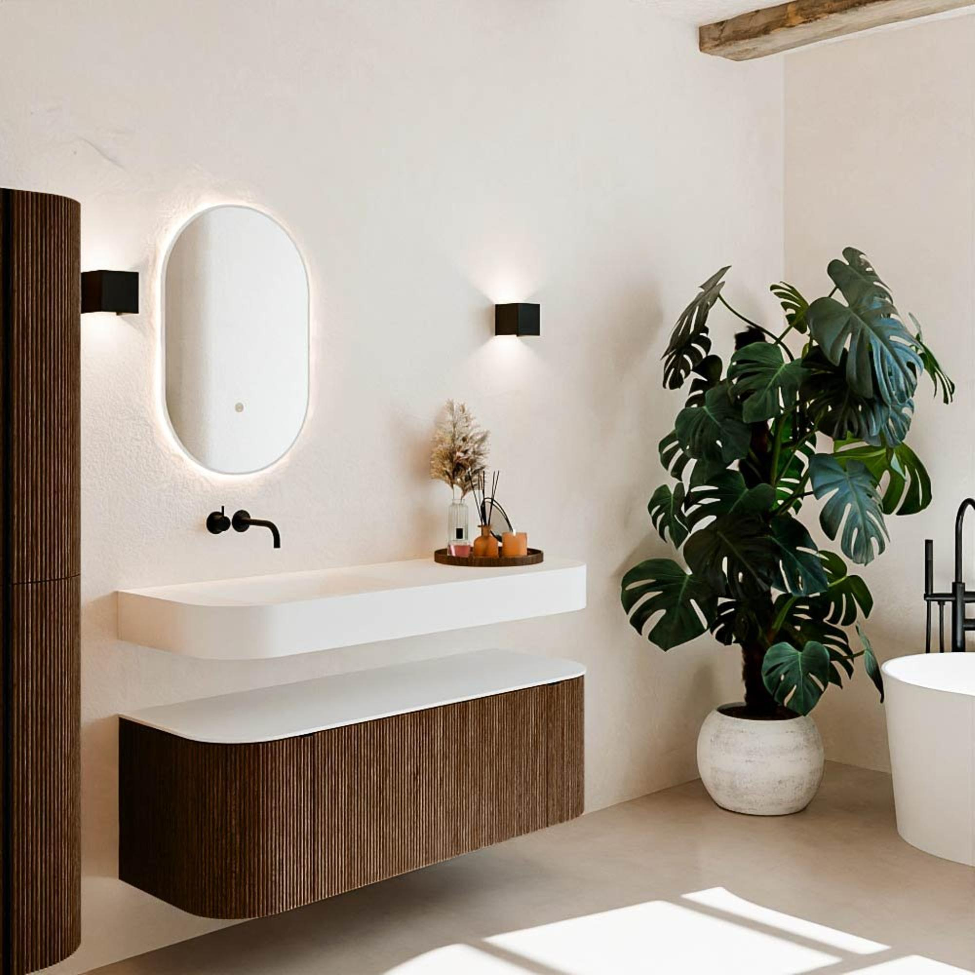 Matériaux naturels aux teintes chaudes. Les reliefs verticaux apportent rythme et texture au design, tandis que le chêne confère une apparence chaleureuse et artisanale. Choisissez parmi 5 teintes de bois OAK, WALNUT, DUSK, SHADOW et RUBY, des couleurs de bois soigneusement sélectionnées pour enrichir les salles de bains modernes et classiques.