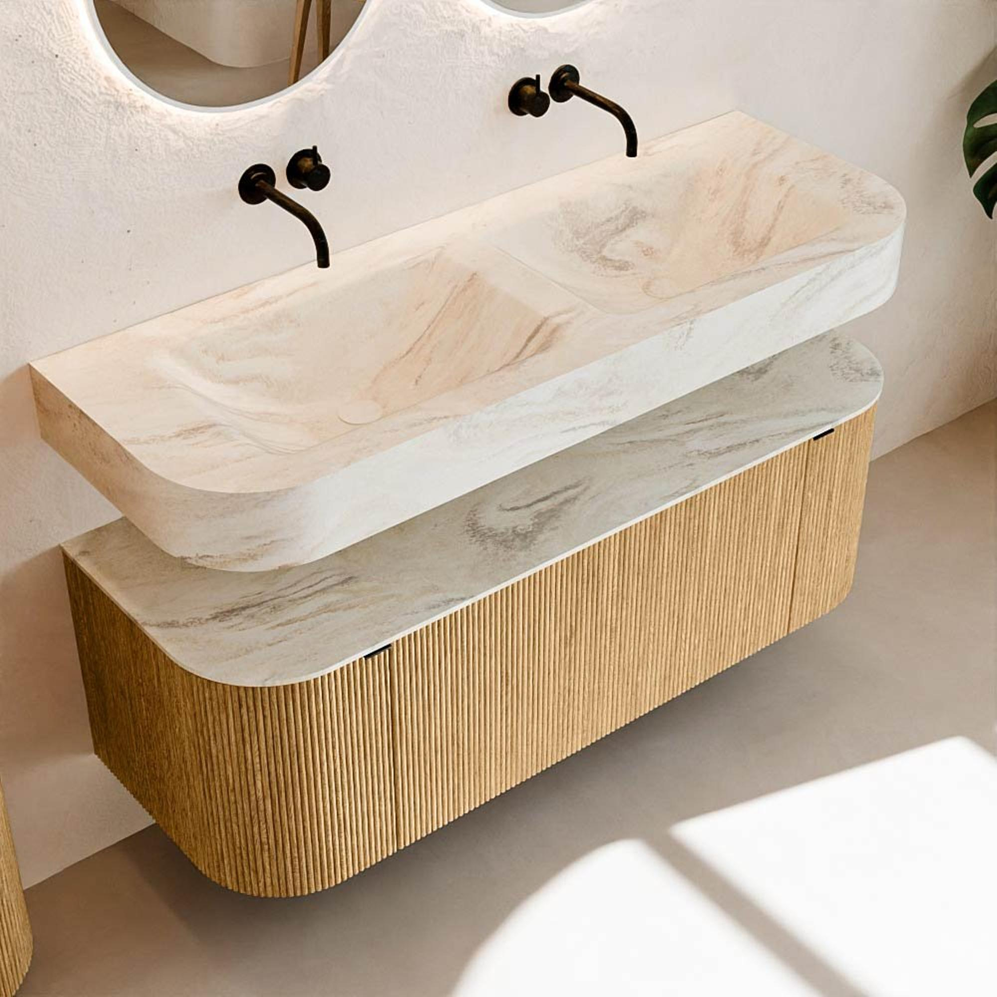 MONDIAZ THOR-DLUX 130cm meuble de salle de bains arrondi gauche + droite couleur Oak avec 1 tiroir et 2 portes. Vasque suspendue CLOUD Double sans trou de robinet couleur Ostra.