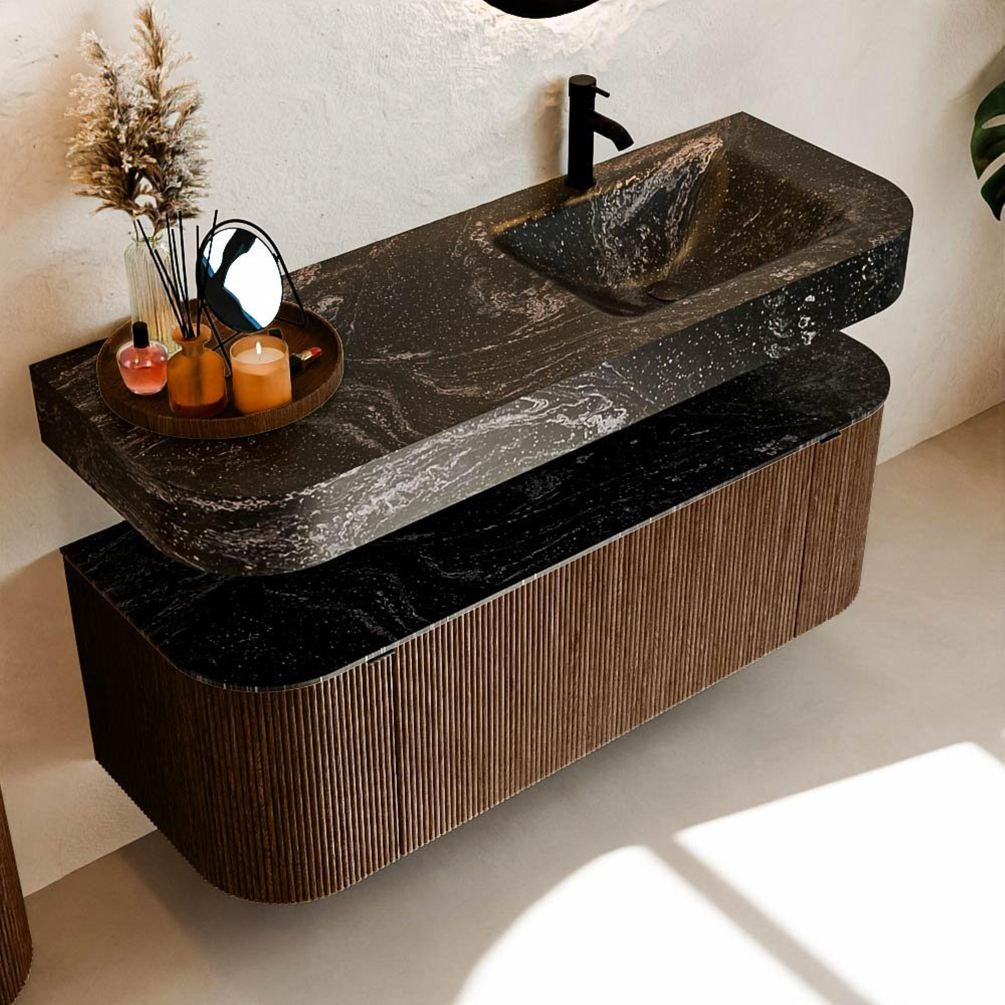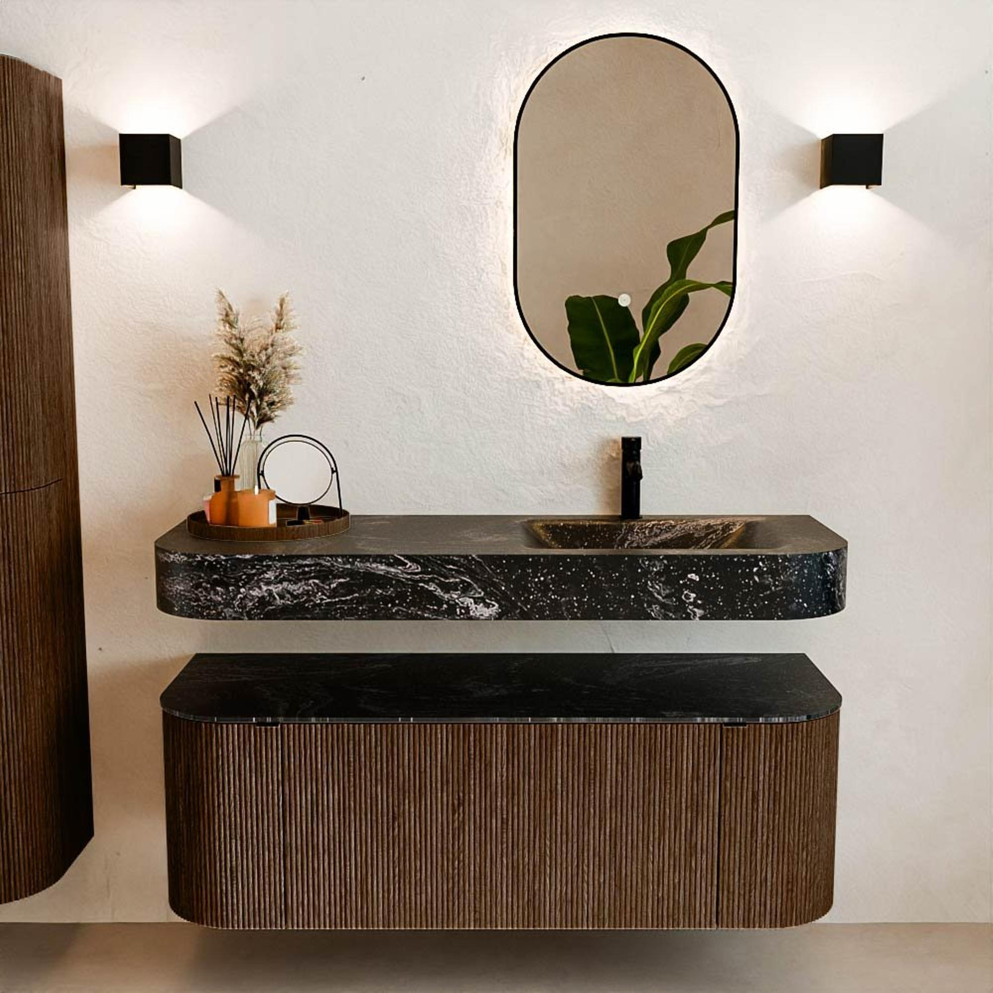 MONDIAZ THOR-DLUX 130cm meuble de salle de bains arrondi gauche + droite couleur Walnut avec 1 tiroir et 2 portes. Vasque suspendue CLOUD Droite 1 trou de robinet couleur Lava.