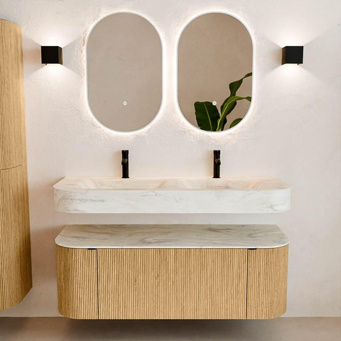 MONDIAZ THOR-DLUX Meuble de salle de bains 130cm arrondi gauche + droite couleur Oak avec 1 tiroir et 2 portes. Vasque suspendue CLOUD Double 2 trous de robinet couleur Ostra.