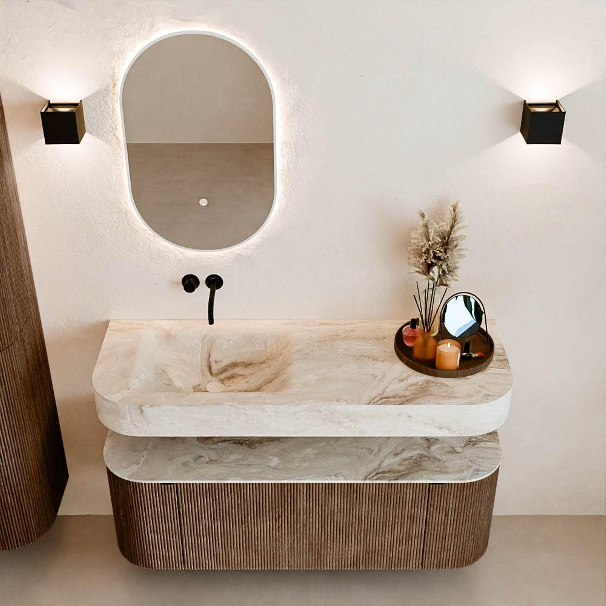 Au-dessus du meuble flotte une vasque suspendue assortie aux coins arrondis – parfaitement adaptée à la forme du meuble. La vasque est réalisée en Solid Surface et suit subtilement les lignes du meuble sous-jacent, créant ainsi un ensemble harmonieux. Le plan de travail en Solid Surface forme une base solide, facile d’entretien et complète la combinaison.
