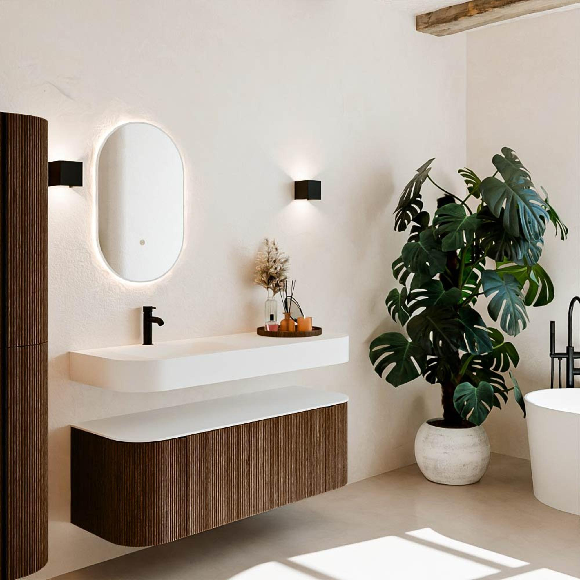 Au-dessus du meuble flotte une vasque suspendue assortie avec des angles arrondis – parfaitement adaptée à la forme du meuble. La vasque est en Solid Surface et suit subtilement les lignes du meuble inférieur, créant un ensemble harmonieux. Le plan de travail en Solid Surface constitue une base solide, facile d'entretien et complète la combinaison.