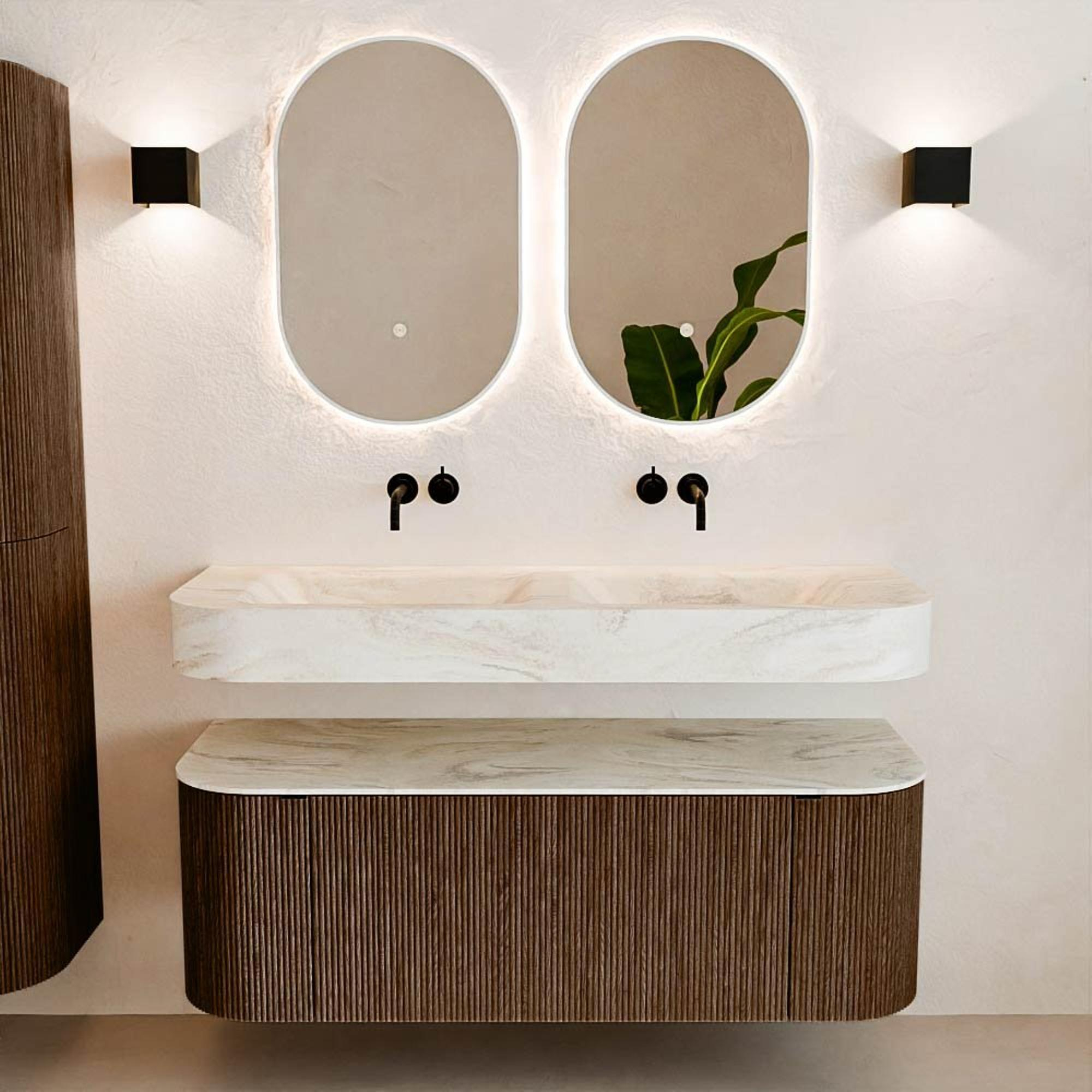 MONDIAZ THOR-DLUX 130cm meuble de salle de bains arrondi gauche + droite couleur Walnut avec 1 tiroir et 2 portes. Vasque suspendue CLOUD Double sans trou de robinet couleur Ostra.