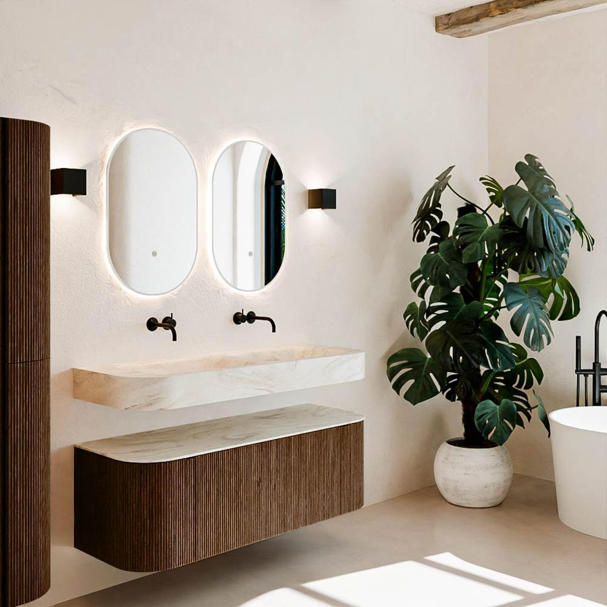 Matériaux naturels dans des tons chauds. Les nervures verticales apportent rythme et texture au design, tandis que le chêne confère une apparence chaleureuse et artisanale. Choisissez parmi 5 teintes de bois OAK, WALNUT, DUSK, SHADOW et RUBY, des couleurs de bois soigneusement sélectionnées pour enrichir les salles de bains modernes et classiques.