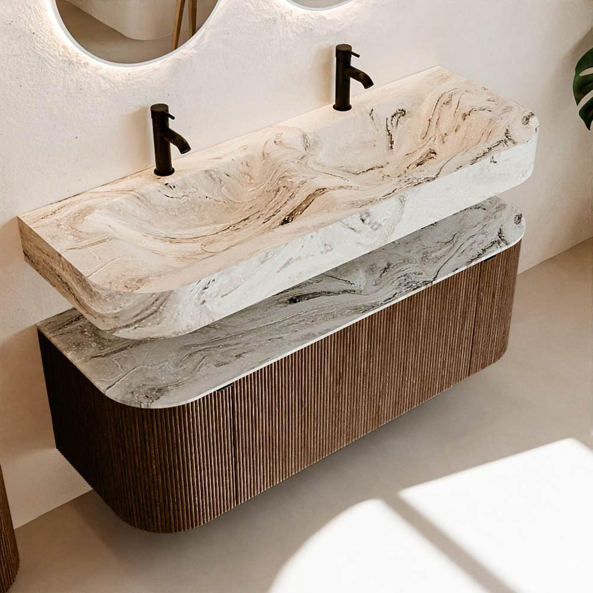 MONDIAZ THOR-DLUX Meuble de salle de bains 130cm arrondi gauche + droite couleur Walnut avec 1 tiroir et 2 portes. Vasque suspendue CLOUD Double 2 trous de robinet couleur Glace.