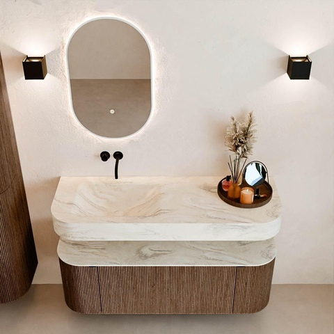 MONDIAZ THOR-DLUX Meuble de salle de bains 130cm arrondi gauche + droite couleur Walnut avec 1 tiroir et 2 portes. Vasque suspendue CLOUD Gauche sans trou de robinet couleur Ostra.