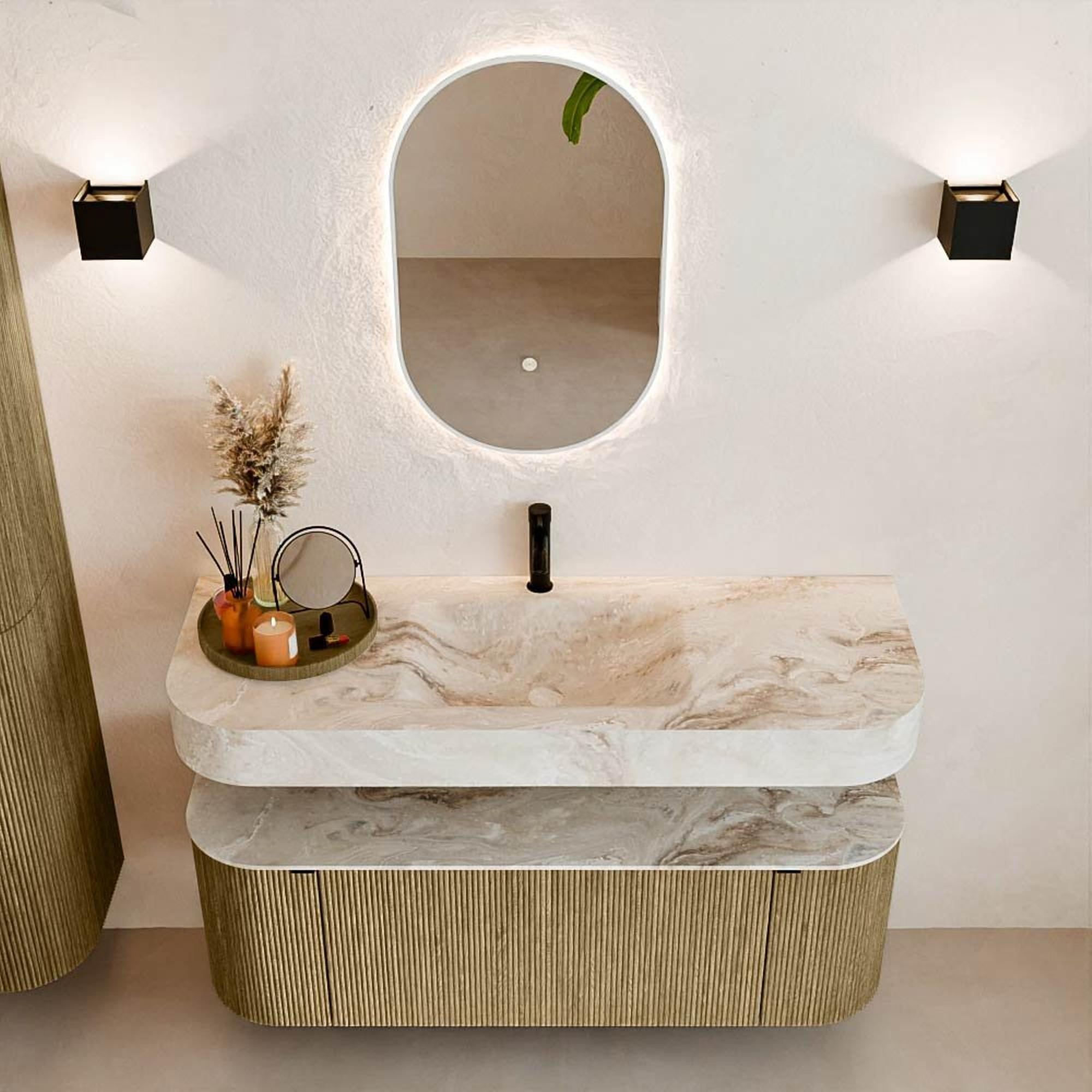 Matériaux naturels dans des tons chauds. Les rainures verticales apportent rythme et texture au design, tandis que le chêne confère une apparence chaleureuse et artisanale. Choisissez parmi 5 teintes de bois OAK, WALNUT, DUSK, SHADOW et RUBY, des couleurs de bois soigneusement sélectionnées pour enrichir les salles de bains modernes et classiques.
