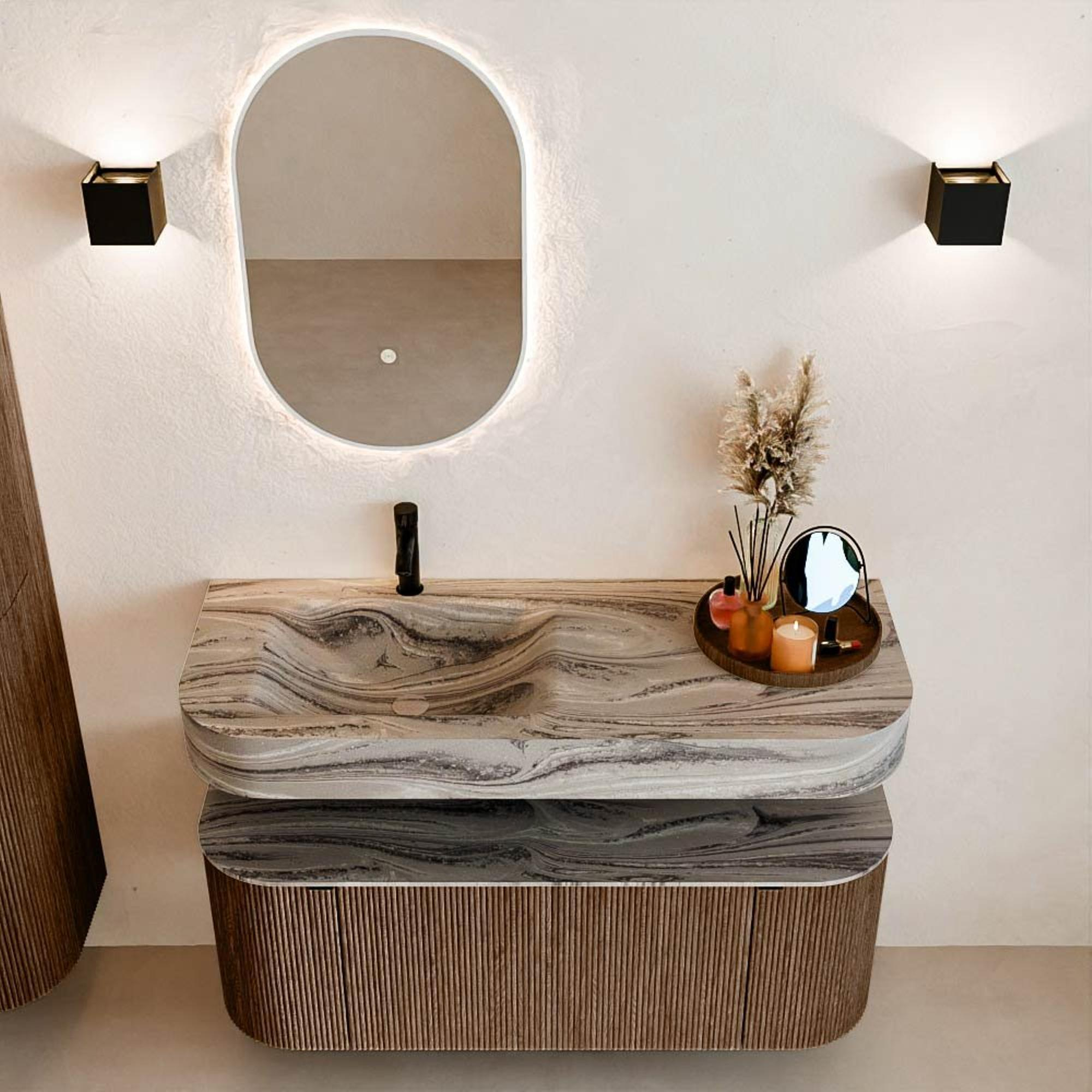 Matériaux naturels aux teintes chaudes. Les nervures verticales apportent rythme et texture au design, tandis que le chêne confère une apparence chaleureuse et artisanale. Choisissez parmi 5 teintes de bois OAK, WALNUT, DUSK, SHADOW et RUBY, des couleurs de bois soigneusement sélectionnées pour enrichir les salles de bains modernes et classiques.