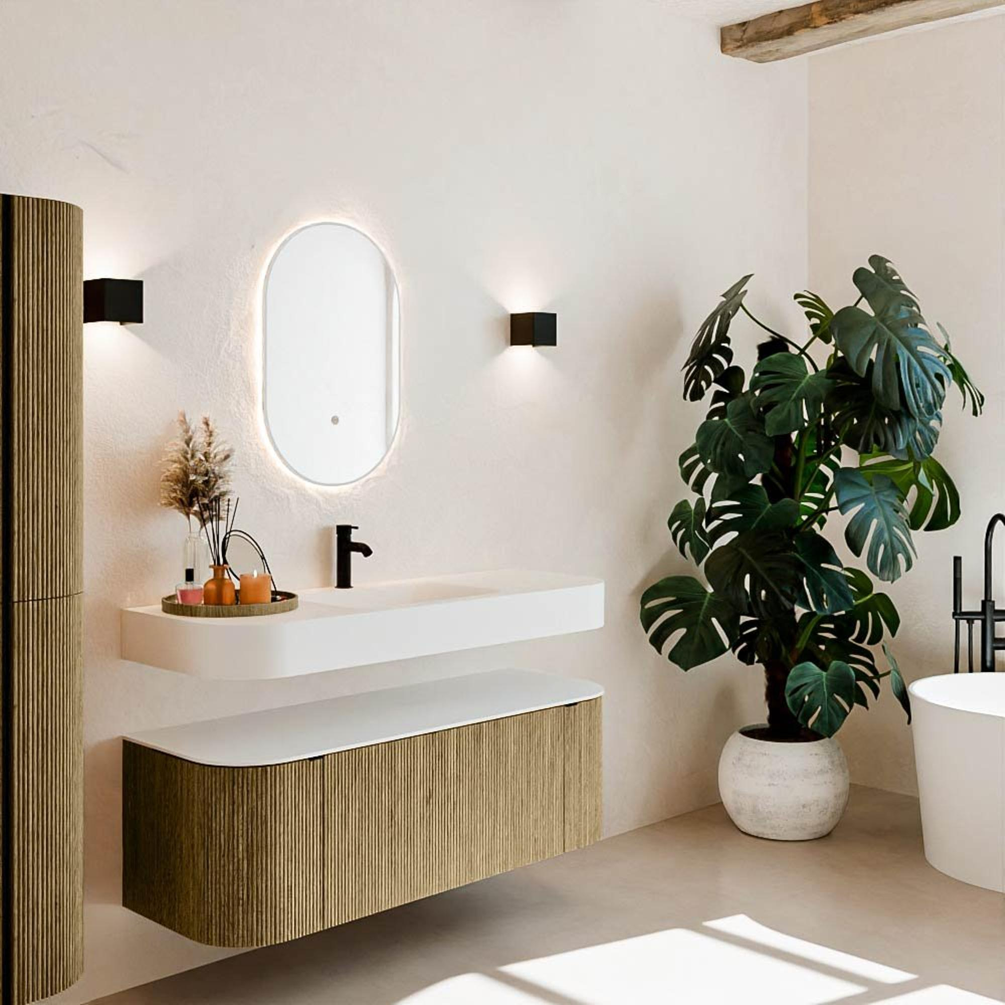 Matériaux naturels dans des tons chauds. Les nervures verticales apportent rythme et texture au design, tandis que le chêne confère une apparence chaleureuse et artisanale. Choisissez parmi 5 teintes de bois OAK, WALNUT, DUSK, SHADOW et RUBY, des couleurs de bois soigneusement sélectionnées pour enrichir les salles de bains modernes et classiques.