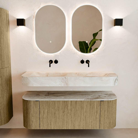 Matériaux naturels dans des tons chauds. Les cannelures verticales apportent rythme et texture au design, tandis que le chêne confère une apparence chaleureuse et artisanale. Choisissez parmi 5 teintes de bois OAK, WALNUT, DUSK, SHADOW et RUBY, des couleurs de bois soigneusement sélectionnées pour enrichir les salles de bains modernes et classiques.