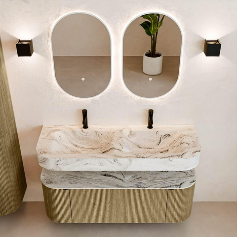 Matériaux naturels dans des tons chauds. Les nervures verticales apportent rythme et texture au design, tandis que le chêne confère une apparence chaleureuse et artisanale. Choisissez parmi 5 teintes de bois OAK, WALNUT, DUSK, SHADOW et RUBY, des couleurs de bois soigneusement sélectionnées pour enrichir les salles de bains modernes et classiques.