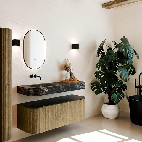 Matériaux naturels dans des tons chauds. Les nervures verticales apportent rythme et texture au design, tandis que le chêne confère une apparence chaleureuse et artisanale. Choisissez parmi 5 teintes de bois OAK, WALNUT, DUSK, SHADOW et RUBY, des couleurs de bois soigneusement sélectionnées pour enrichir les salles de bains modernes et classiques.