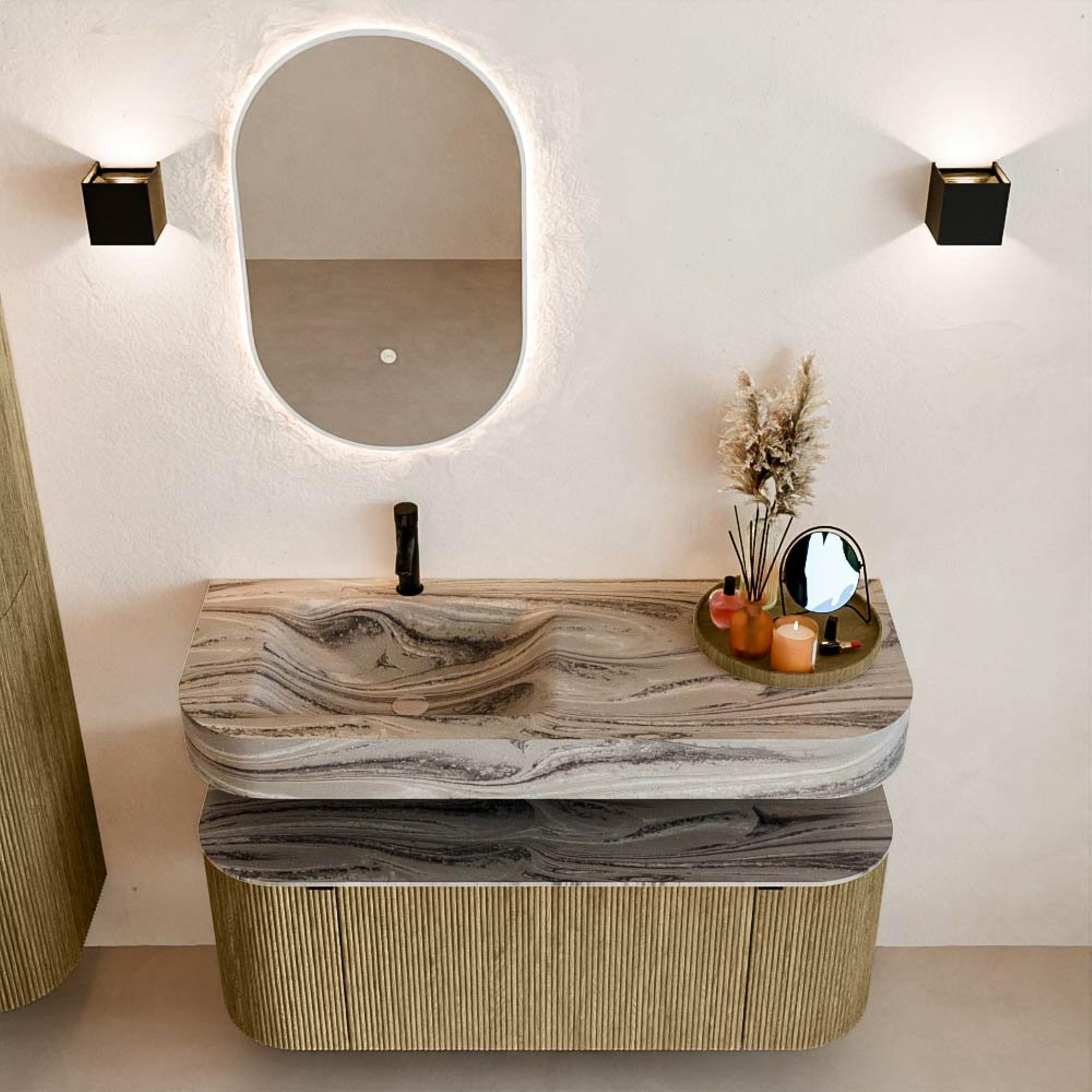 Matériaux naturels dans des tons chauds. Les cannelures verticales apportent rythme et texture au design, tandis que le chêne confère une apparence chaleureuse et artisanale. Choisissez parmi 5 teintes de bois OAK, WALNUT, DUSK, SHADOW et RUBY, des couleurs de bois soigneusement sélectionnées pour enrichir les salles de bains modernes et classiques.