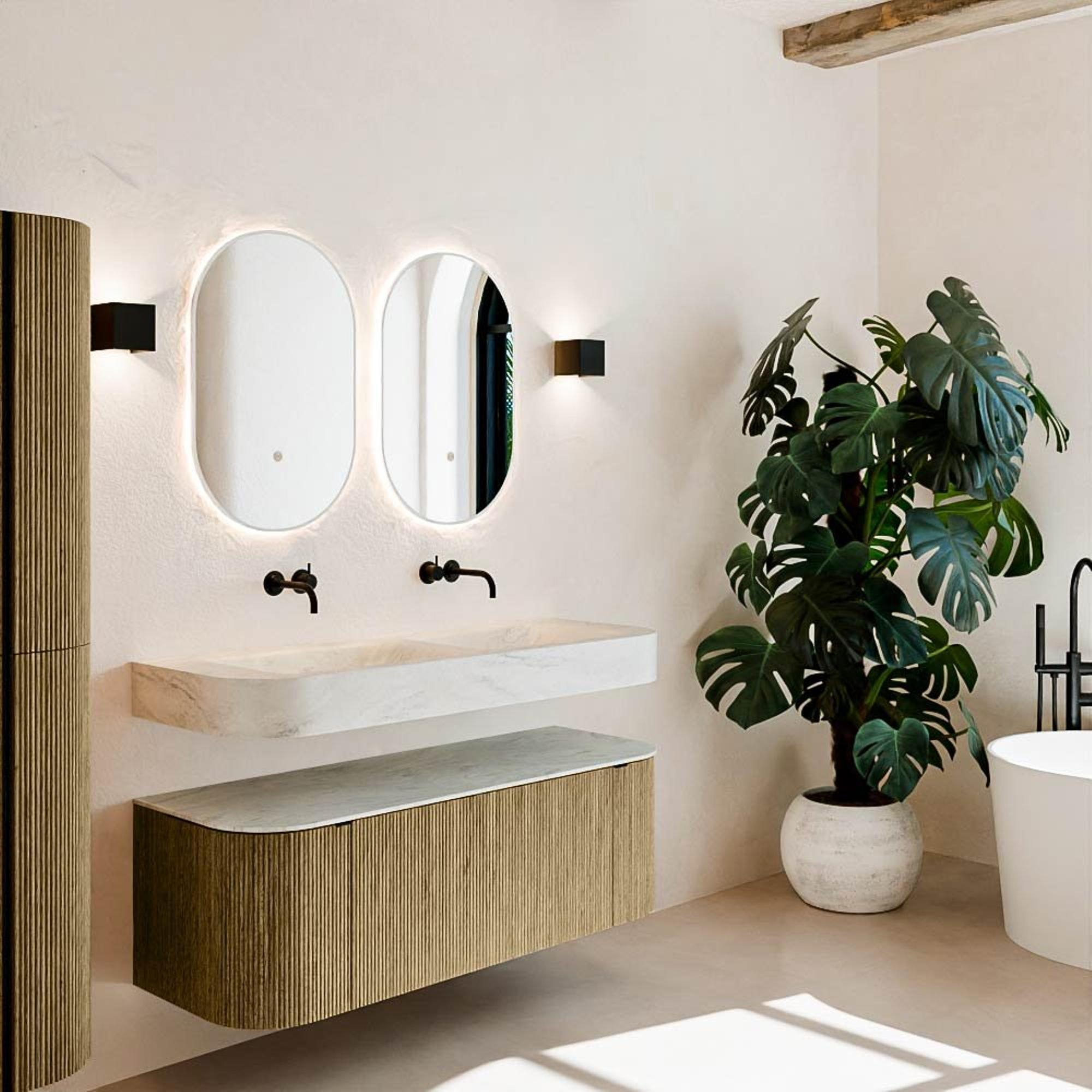 Matériaux naturels dans des tons chauds. Les rainures verticales apportent rythme et texture au design, tandis que le chêne confère une apparence chaleureuse et artisanale. Choisissez parmi 5 teintes de bois OAK, WALNUT, DUSK, SHADOW et RUBY, des couleurs de bois soigneusement sélectionnées pour enrichir les salles de bains modernes et classiques.