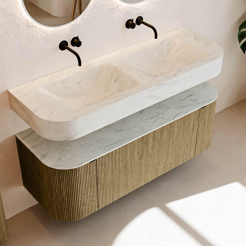 Au-dessus du meuble flotte une vasque suspendue assortie aux coins arrondis – parfaitement adaptée à la forme du meuble. La vasque est réalisée en Solid Surface et suit subtilement les lignes du meuble inférieur, créant ainsi un ensemble harmonieux. Le plan de travail en Solid Surface forme une base solide et facile d'entretien et complète la combinaison.