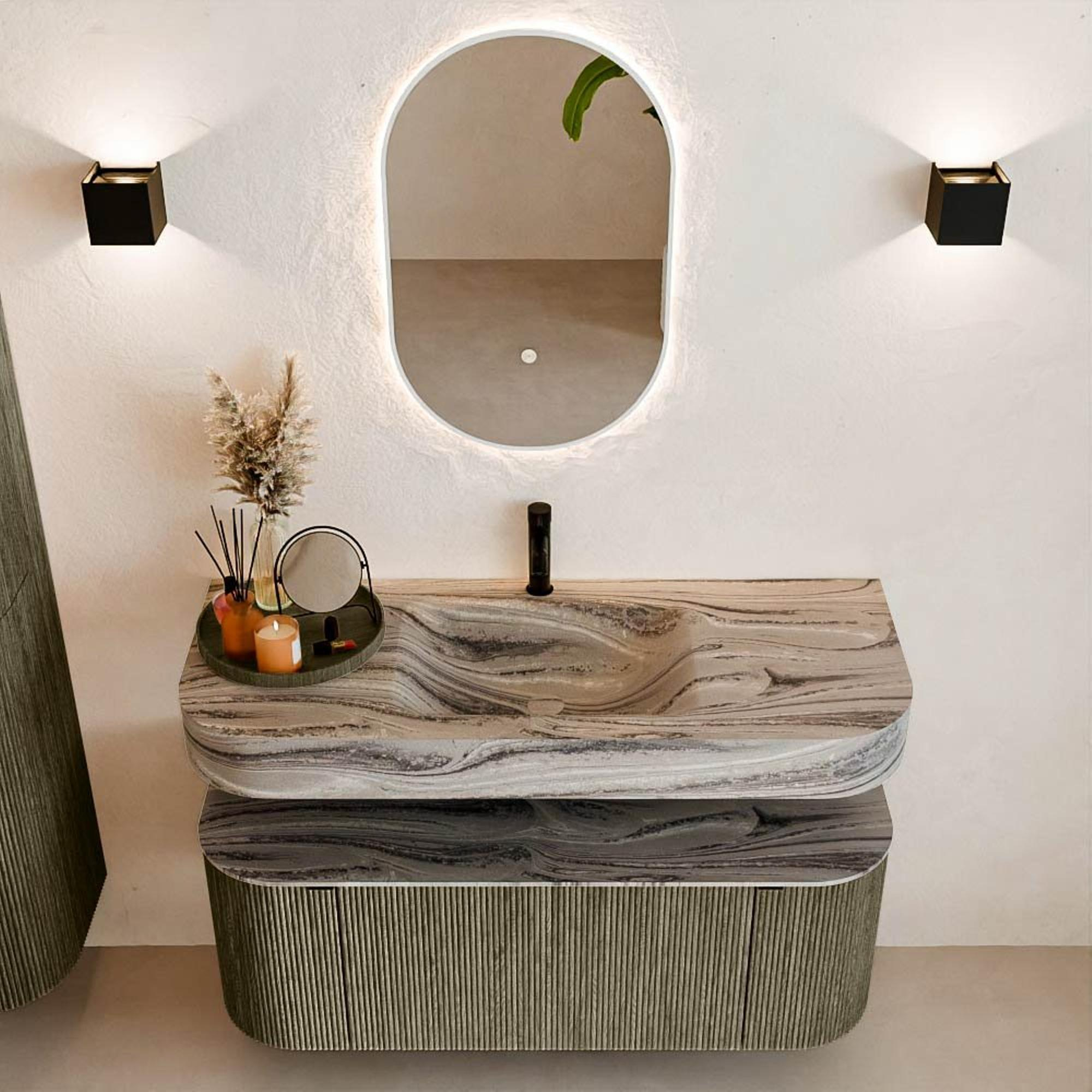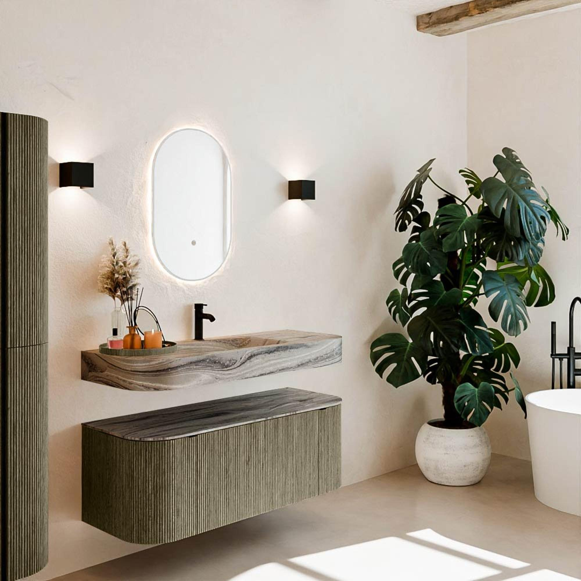 Matériaux naturels aux teintes chaudes. Les nervures verticales apportent rythme et texture au design, tandis que le chêne confère une apparence chaleureuse et artisanale. Choisissez parmi 5 teintes de bois OAK, WALNUT, DUSK, SHADOW et RUBY, des couleurs de bois soigneusement sélectionnées pour enrichir les salles de bains modernes et classiques.
